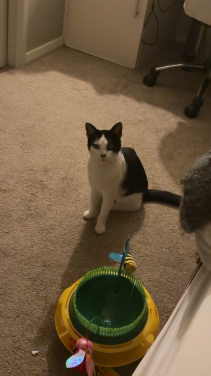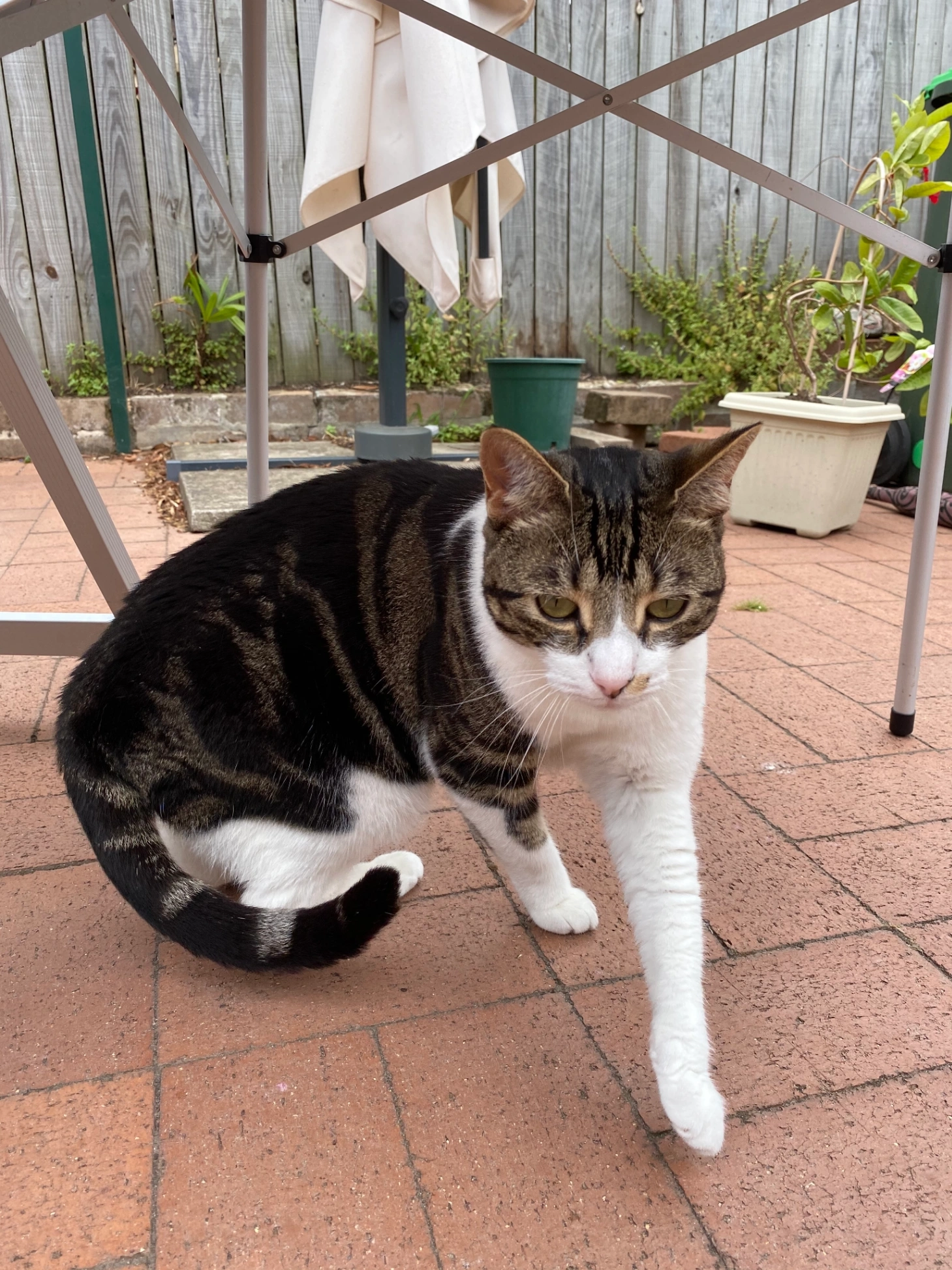 Felix has a largely white body with dark grey face, tail, and feet. He is quite small. He usually wears a red collar though it may have fallen off in his escape