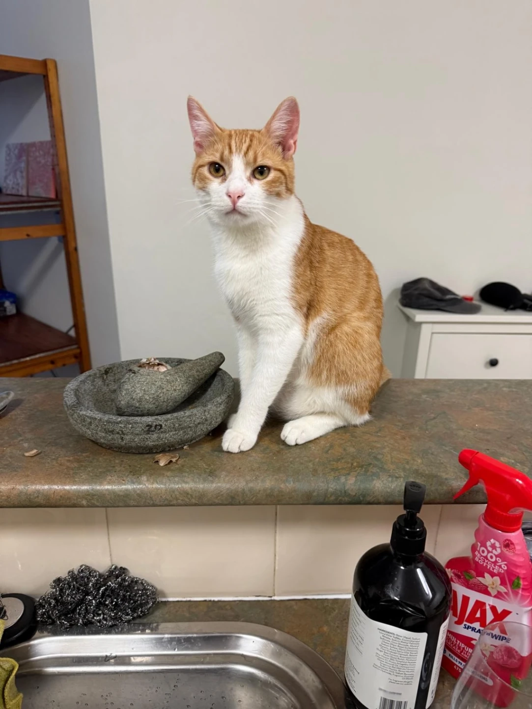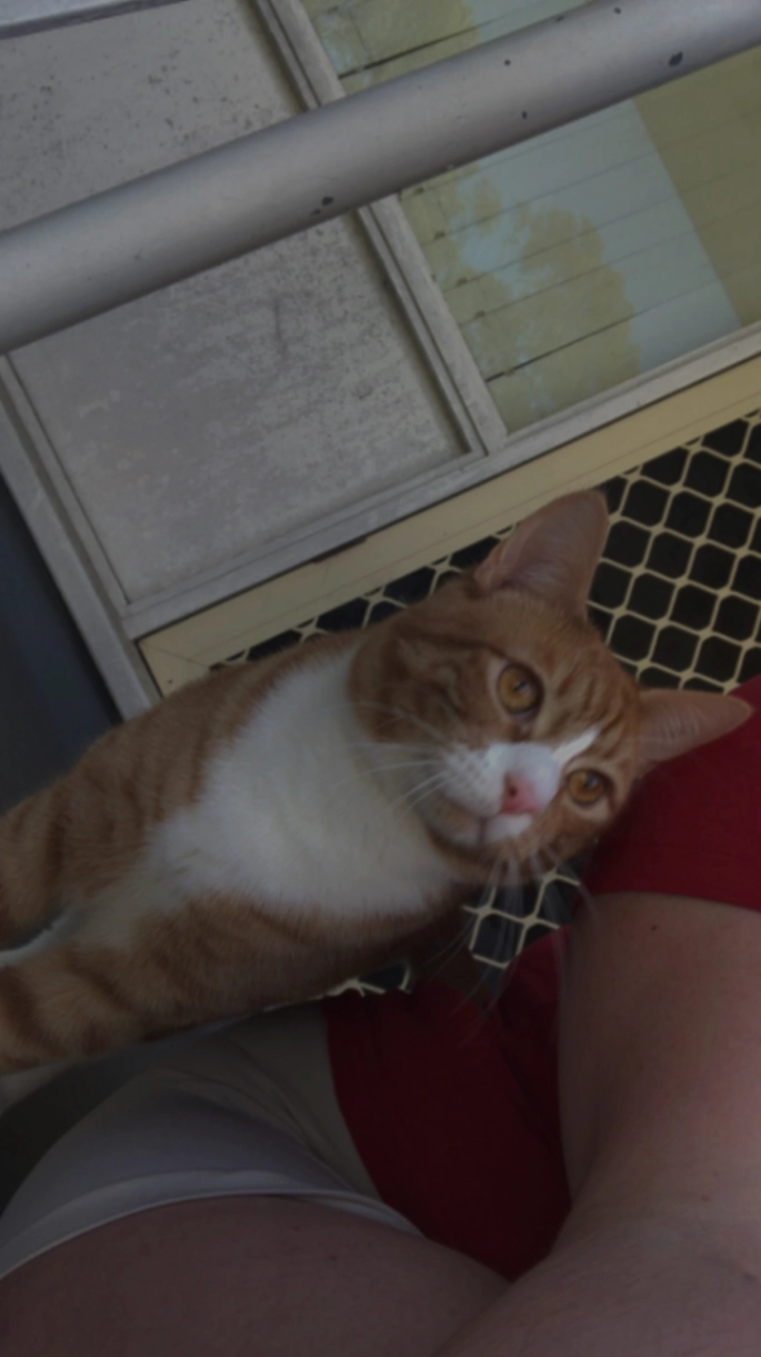 Mercutio is a small ginger and white male cat. He has a white front and paws. He's an indoor only cat and a little nervous, so will be very scared and overwhelmed.