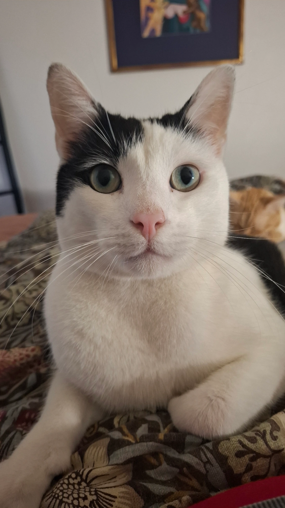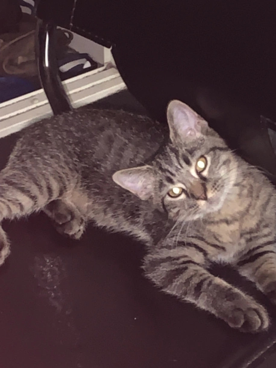 Sidney is a loving boy, shy at first but will respond to his name and to food. He's about 5. He is slender, acrobatic and very nosy. He will enter your house uninvited if you let him. He loves to play.