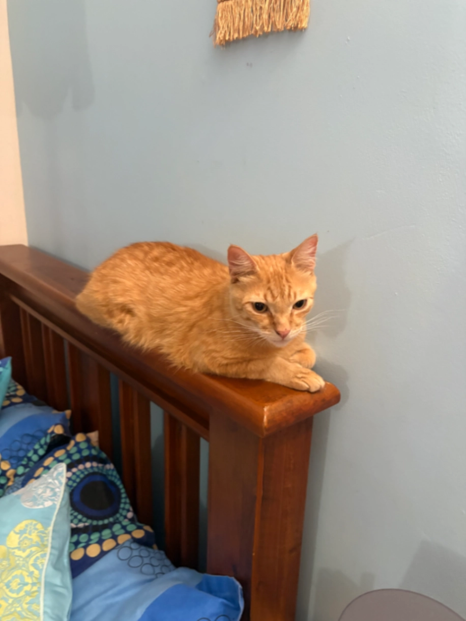 2 year old, male, ginger tabby cat with white chin and neck, green/hazel eyes with bushy tail. Microchipped with fading tattoo on left ear.