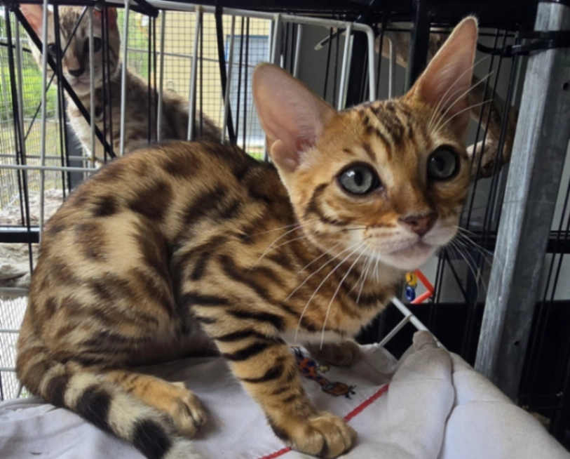 Rocky is a very beautiful boy, he has a brown and beige skin tone, with dark spots all over him, like a cheetah, and has a black and white ringed tail. He has turquoise grey eyes and is a Bengal.