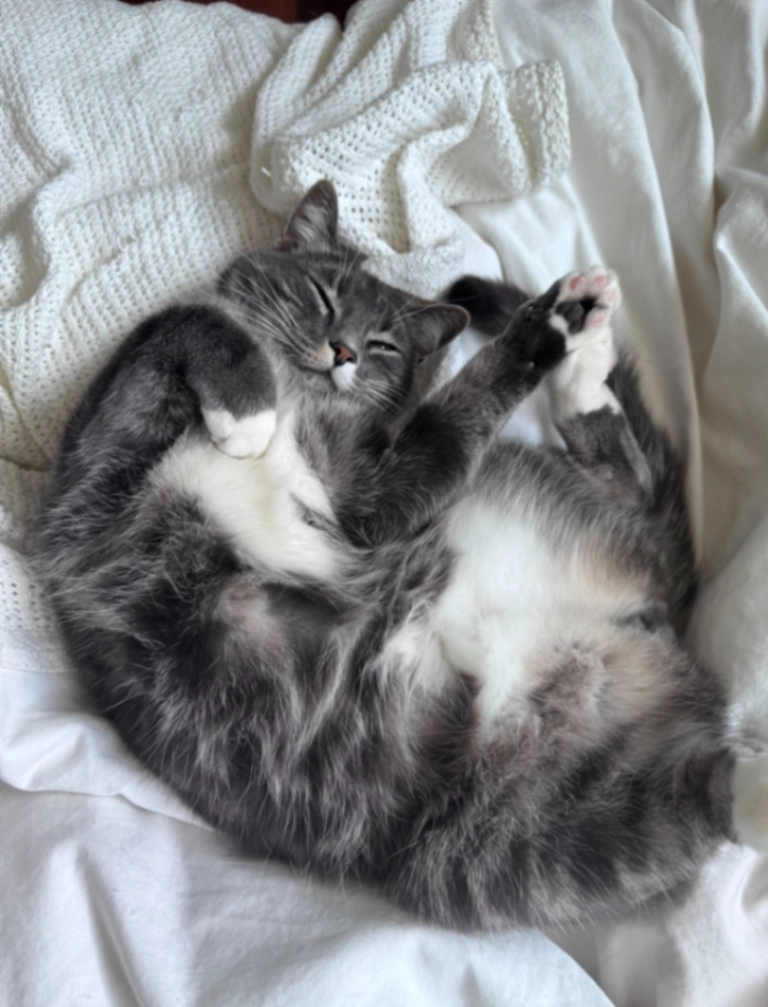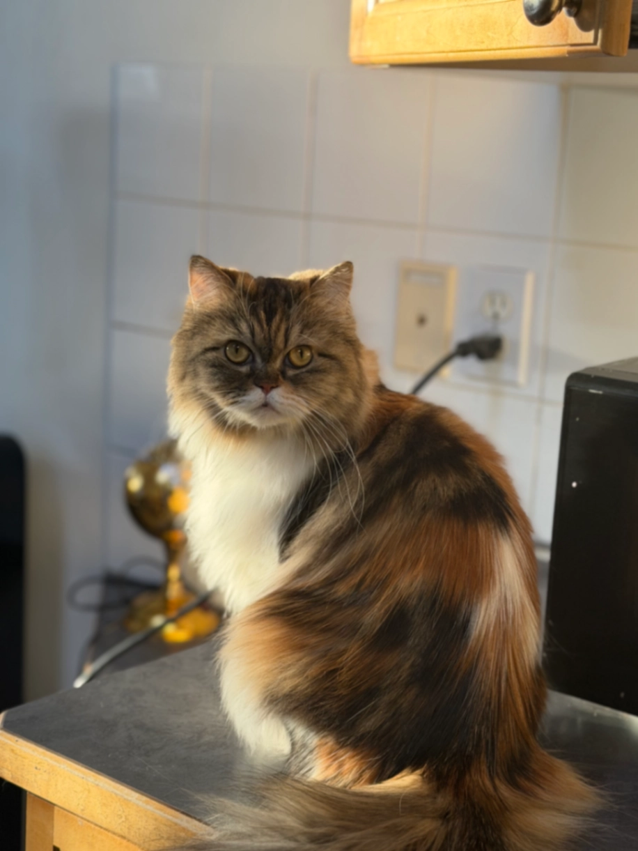 Sheβs really fat and fluffy and friendly and colourful and red kind of black and white