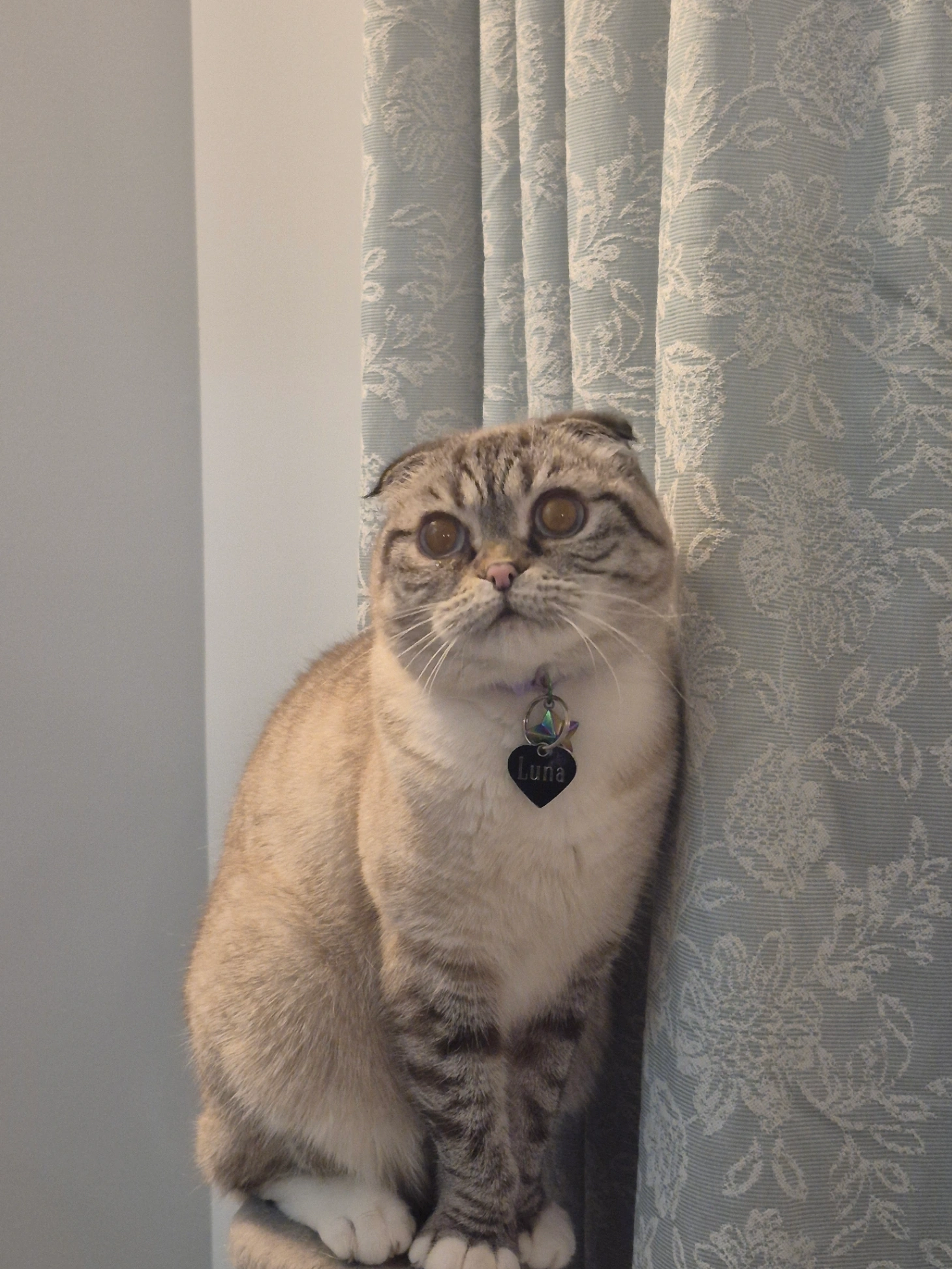 Scottish fold/Siamese 3 year old female. Light blue eyes. No collar at the time. Fixed and indoor only