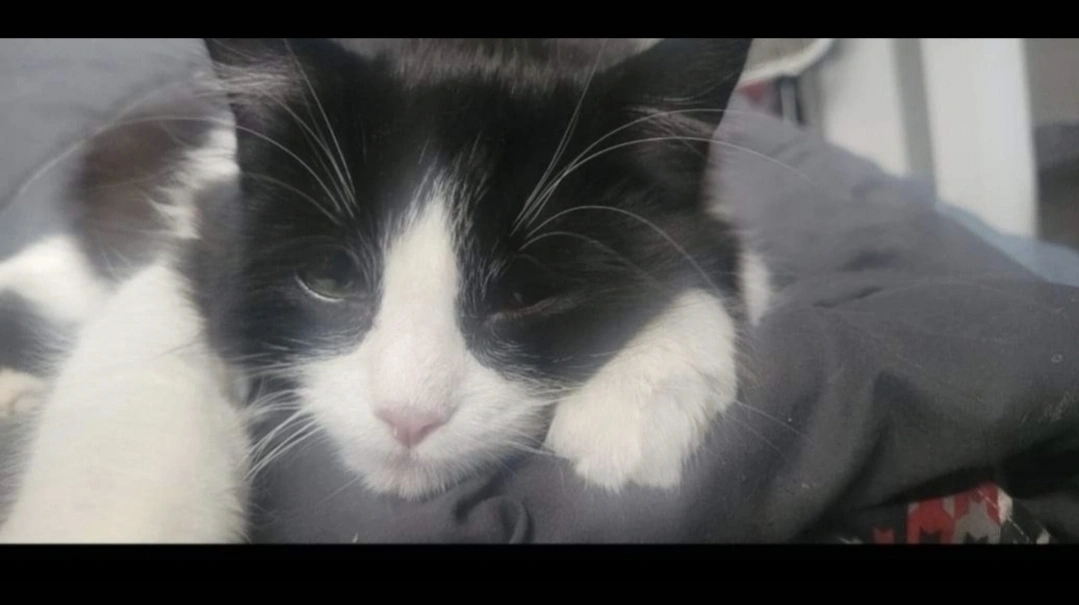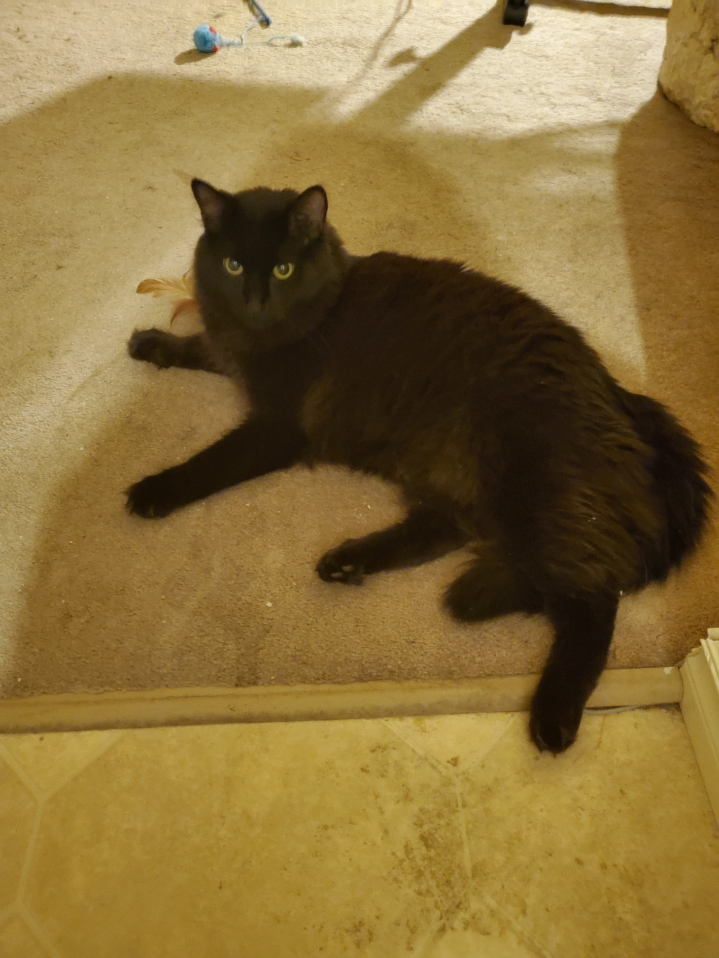 Two year old neutered male, all black skinny body with a long tail, big ears that are slightly bald. High pitched meow and a chatty boy