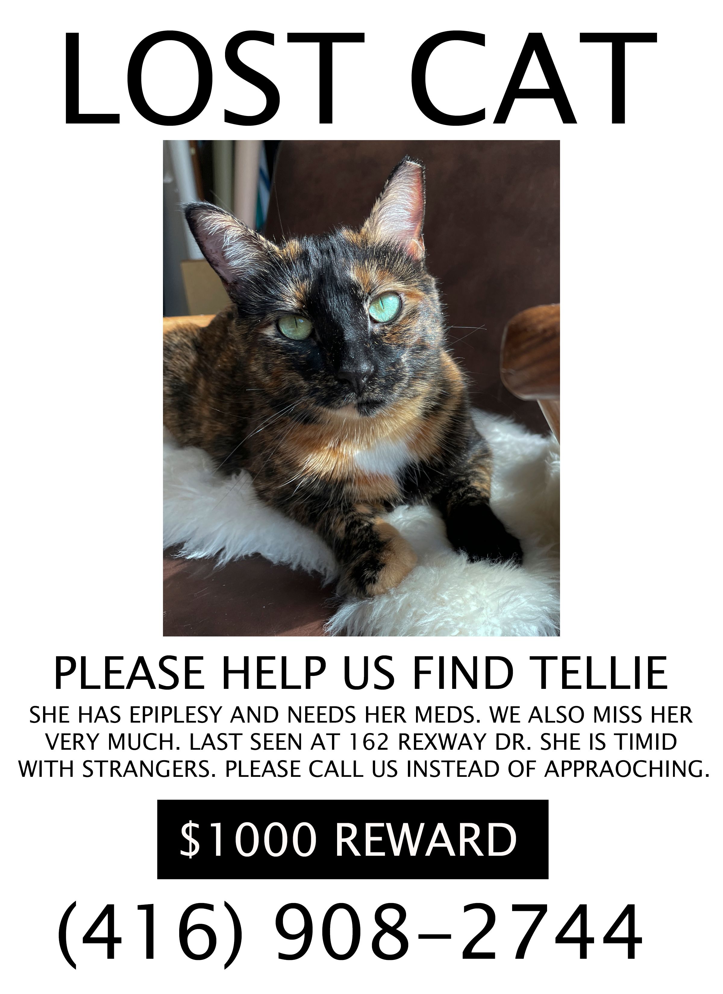 She is a calico cat. Black orange with a patch of white on her chest and stomach. She is slim and about 4 years old. Her left front paw is all black. Her left ear is clipped. Her eyes are green.