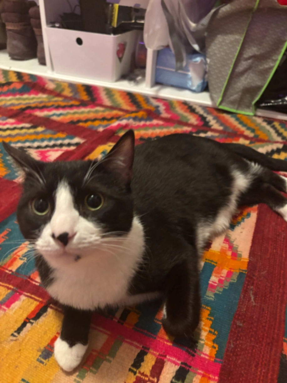 A little fat, black and white, has a little black spot on his bottom lip, a black diamond on his belly, a black nose, his paws are pink on one side