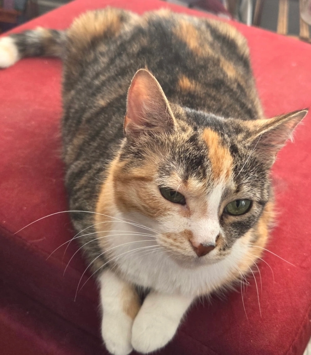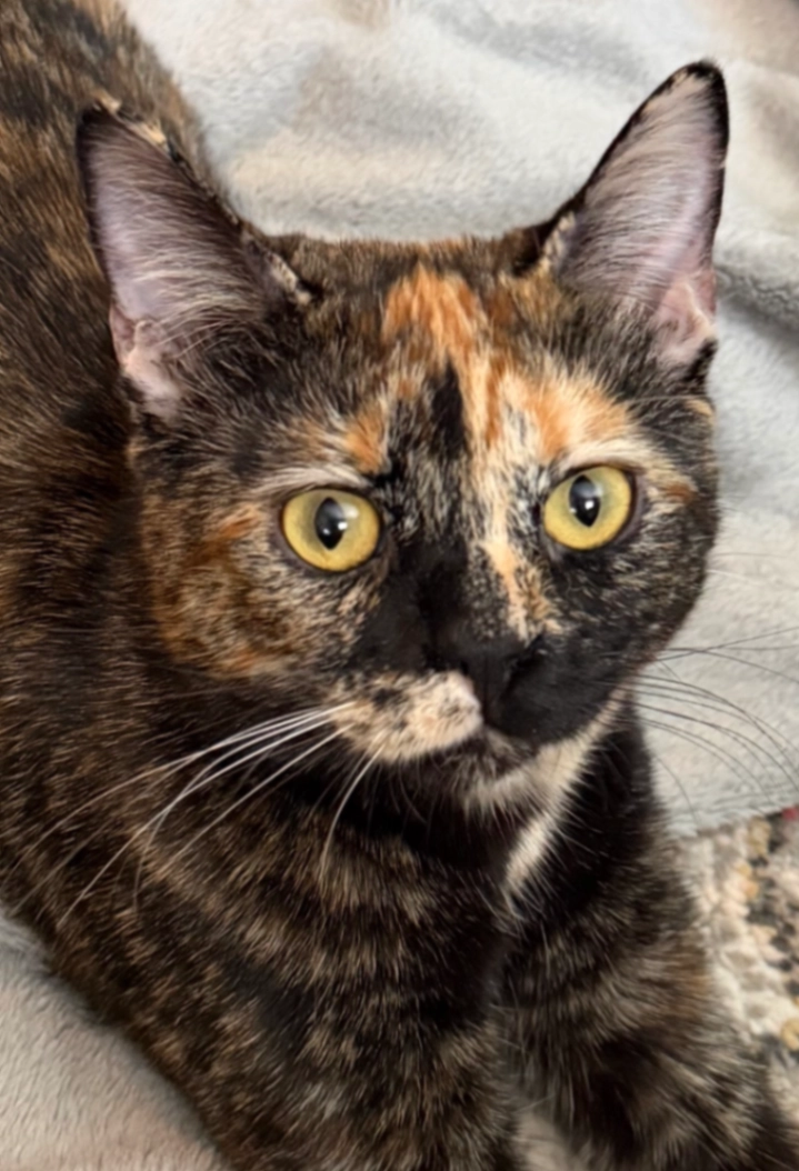 Female tortie, beautiful green eyes. Missing two incisors. Very vocal and affectionate. 6 years old