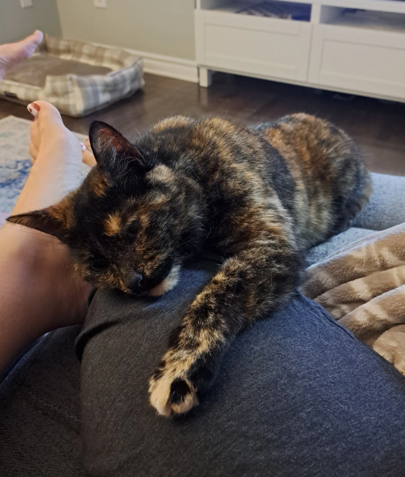 Tortie female kitten - 9 months. White patch on belly, otherwise black with orange stripes, beige and some white. Green eyes, very friendly