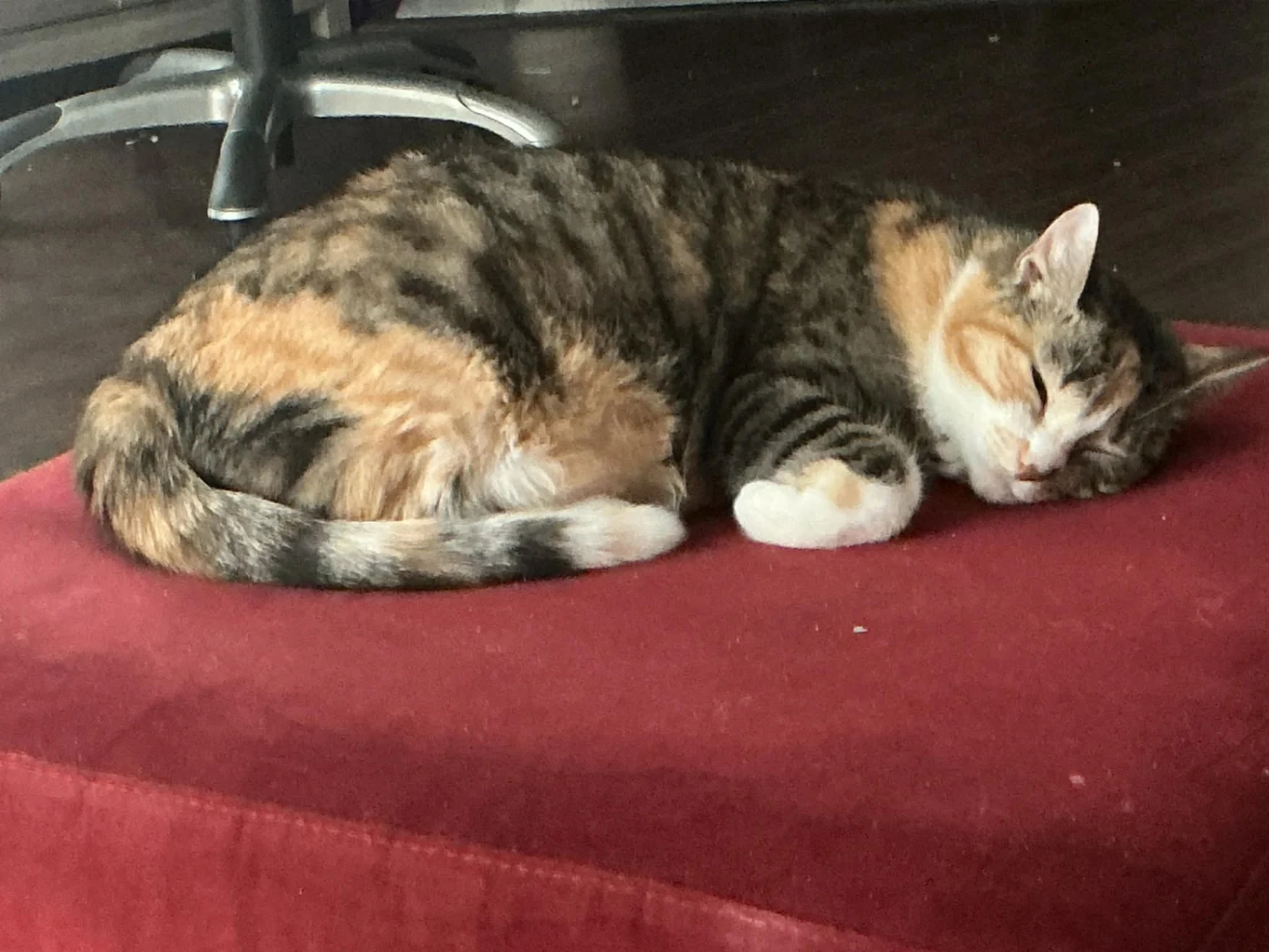 Shes a small calico tabby cat with distinct orange and black markers on her face. She is super sweet and timid with a soft meow. Very friendly. Has never been outside before