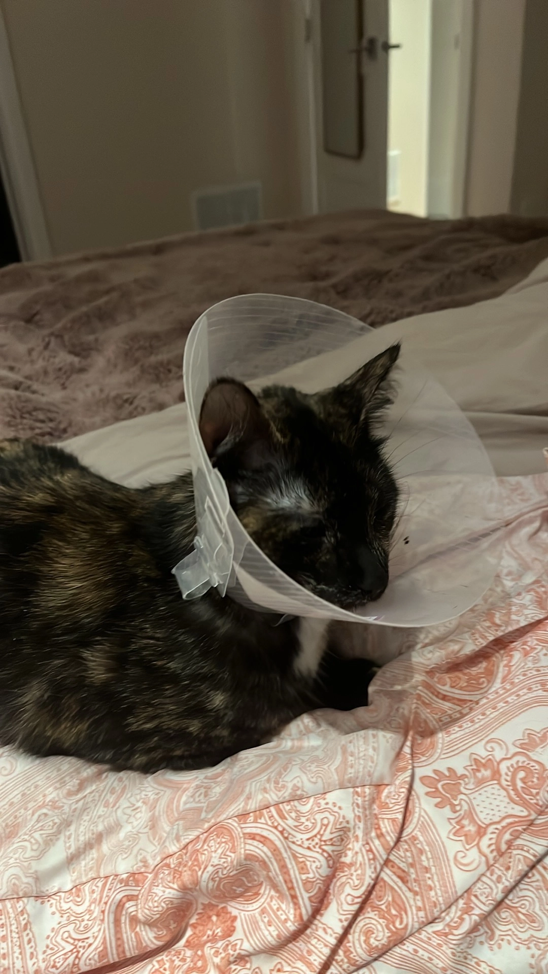 Yeux vert, poil écaille de tortue, elle n a plus le cône, tâche blanche sous le menton