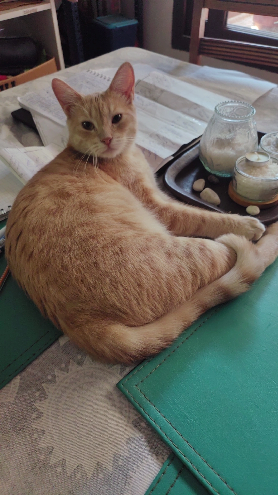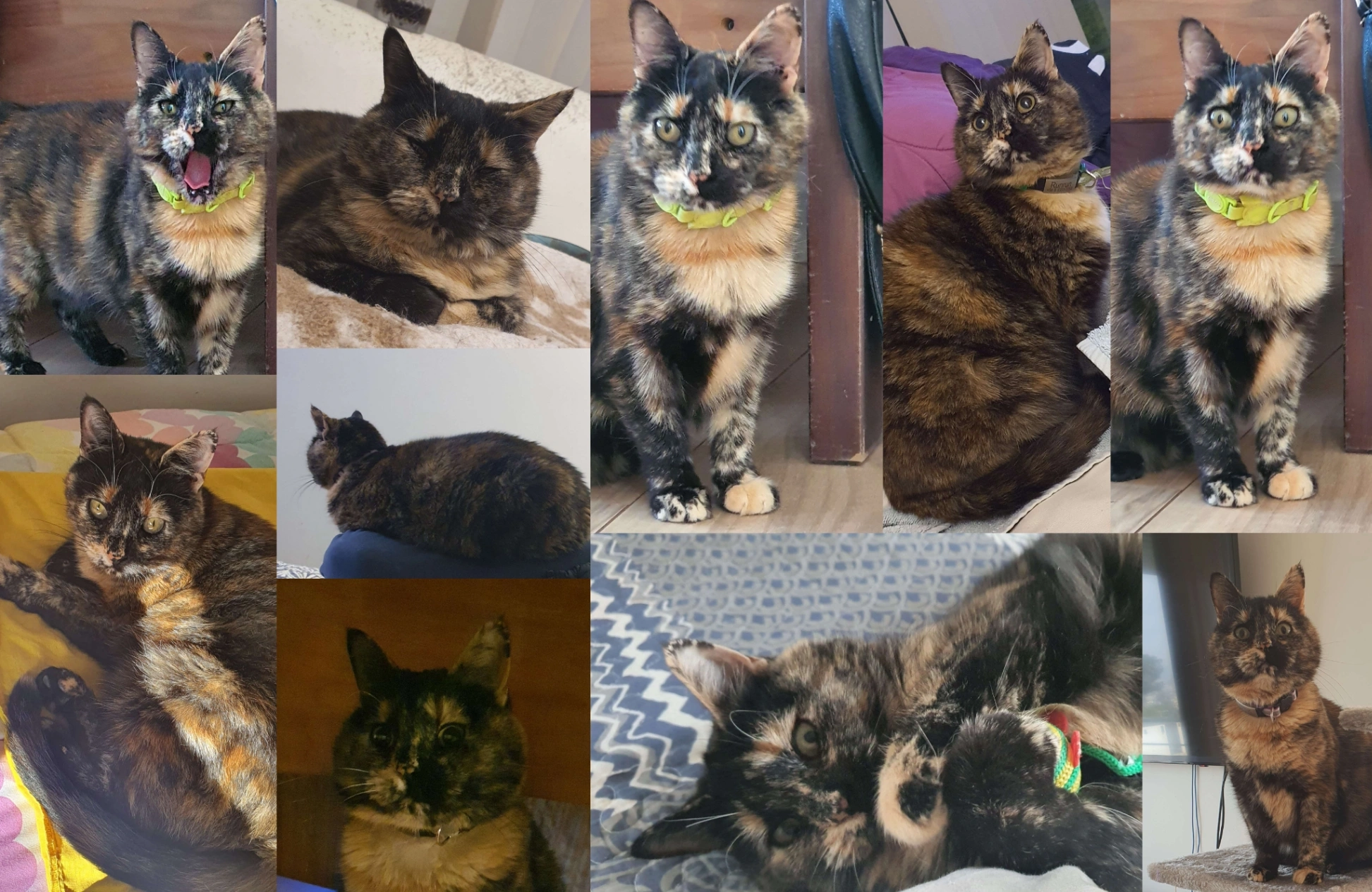 Su collar es celeste-gris y tiene el nombre "Runrun" más el número de teléfono