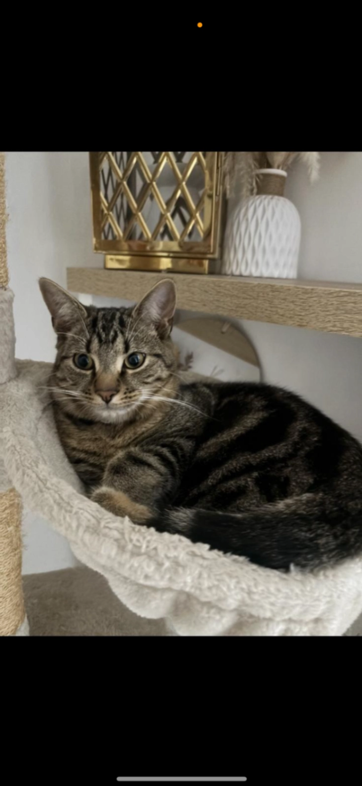 Tabby cat yellow eyes, small white dot on chest, white chin, long tail, ginger belly.