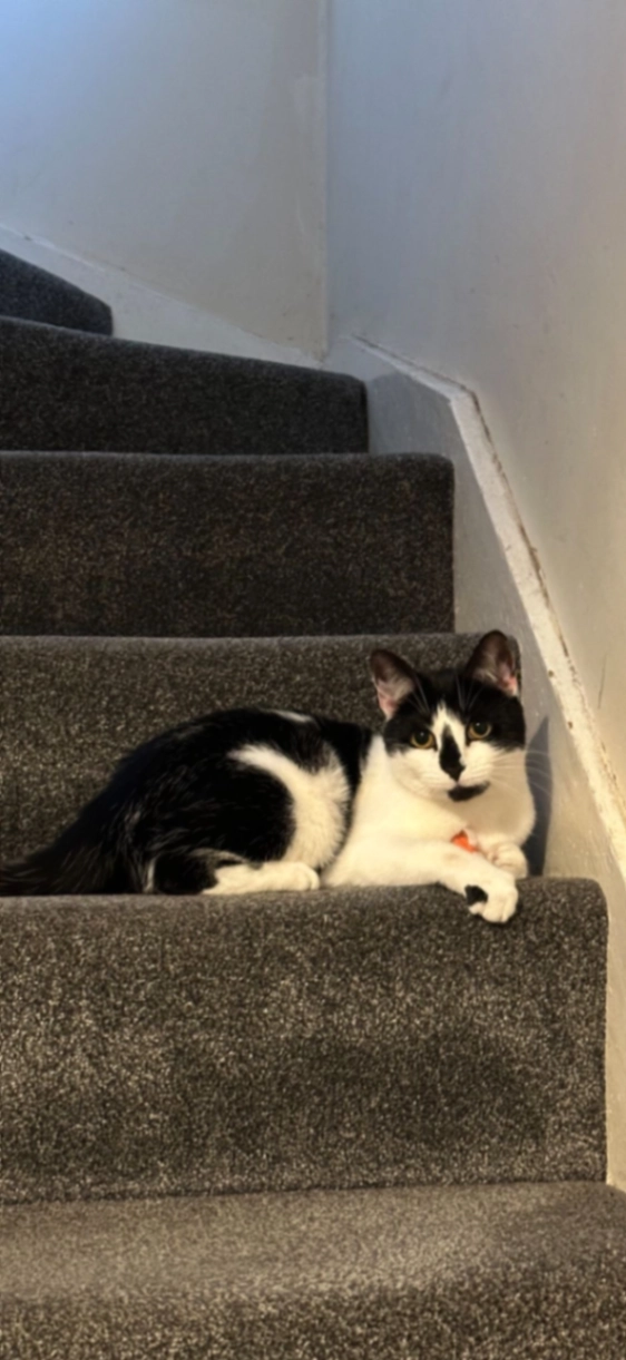 3 year old white & ginger female. Friendly but cautious so may not approach you if she’s frightened.