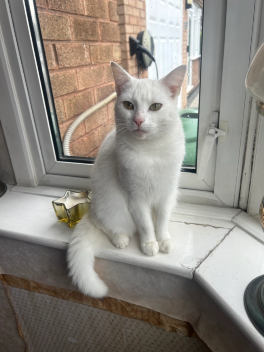 All white cat, approx 5 years old, slim, very shy, no collar, no microchip