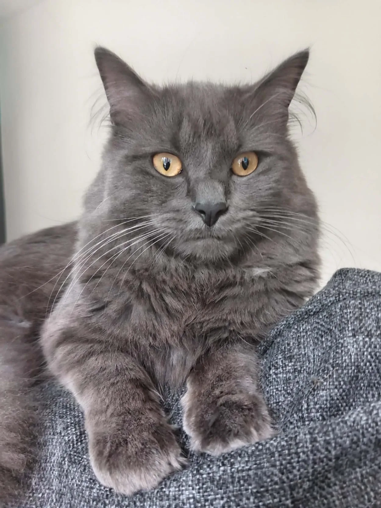 Grey male cat, short haired. Can be shy. Has a multi coloured knitted collar on. Chipped and neutered.