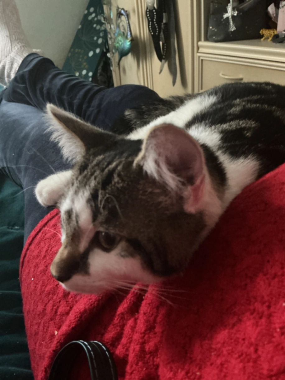 Approximately 4 to 5 months old dark brindle with white underbelly feet and neck .followed Jehovah witnesses and ran in . Grenfell road connecting with Moor Park drive . Totally friendly clean but doesn’t like other cats as we have two .she was very hungry and has pink flea collar with bell