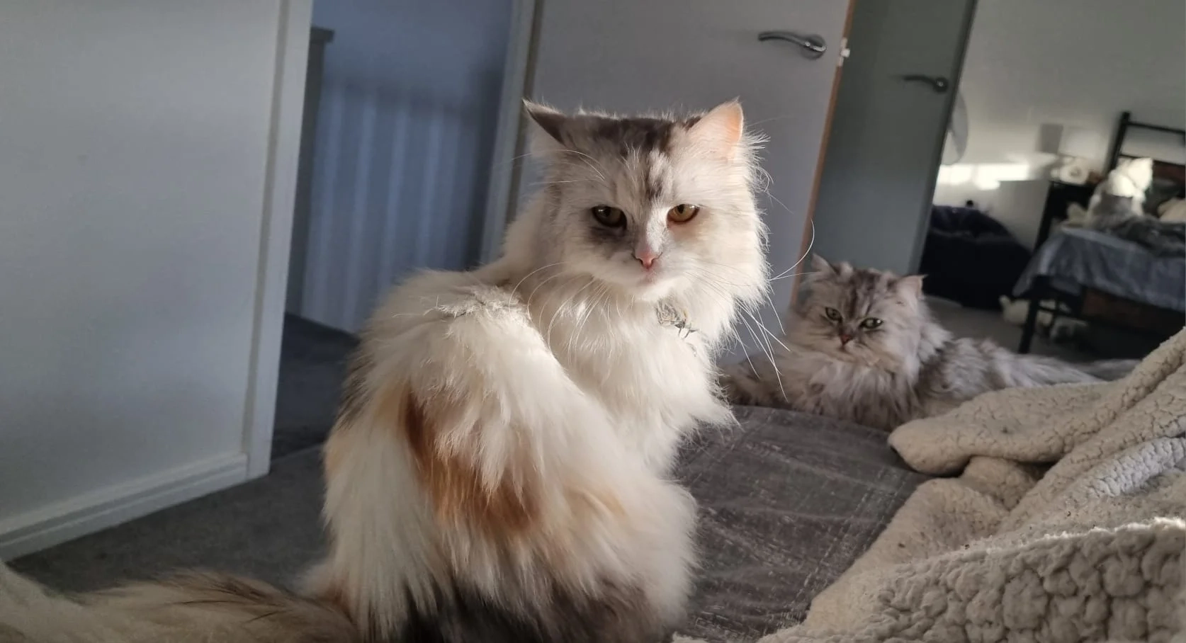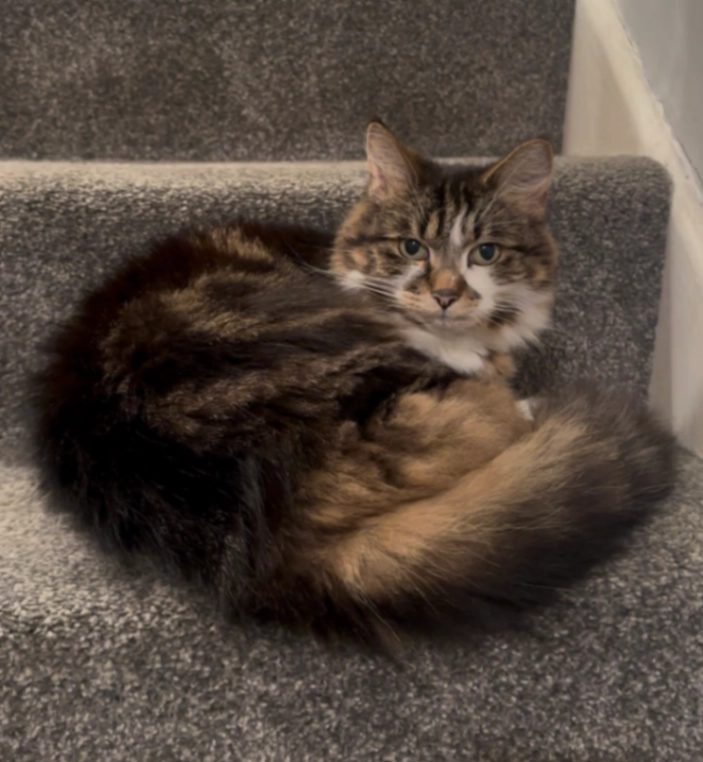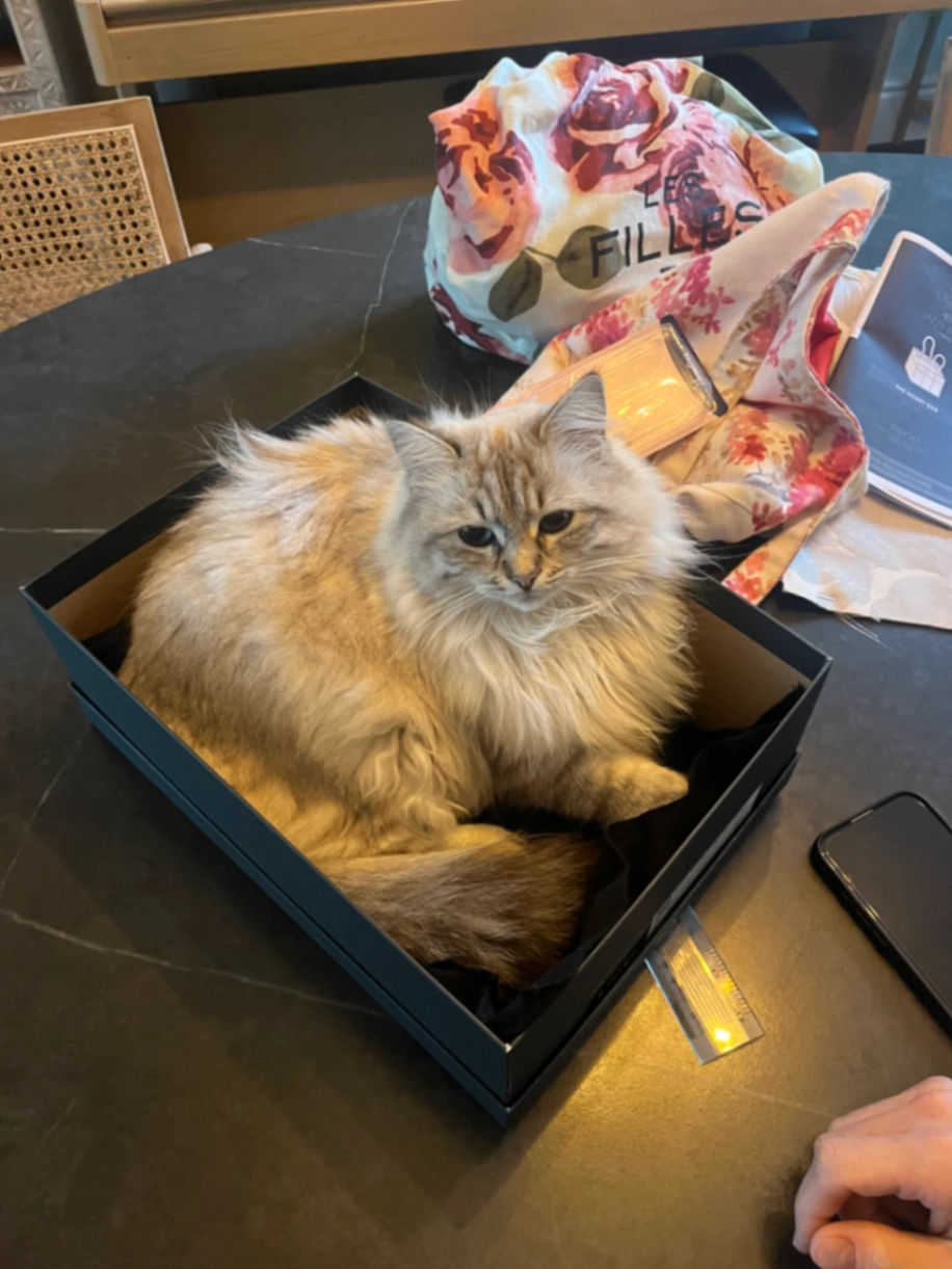 Mollie is a white/silver Siberian cat with bright blue eyes and a pink nose. Shes very fluffy right now with her winter coat. She has a high pitched meow. Shes usually very friendly and affectionate and curious.