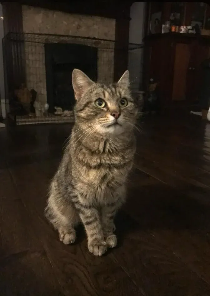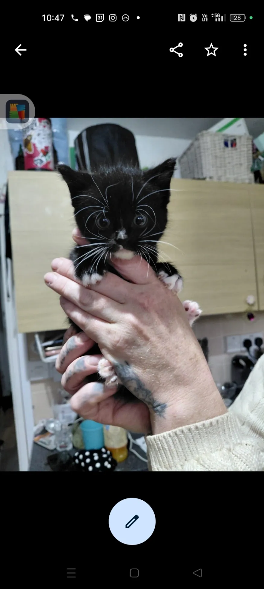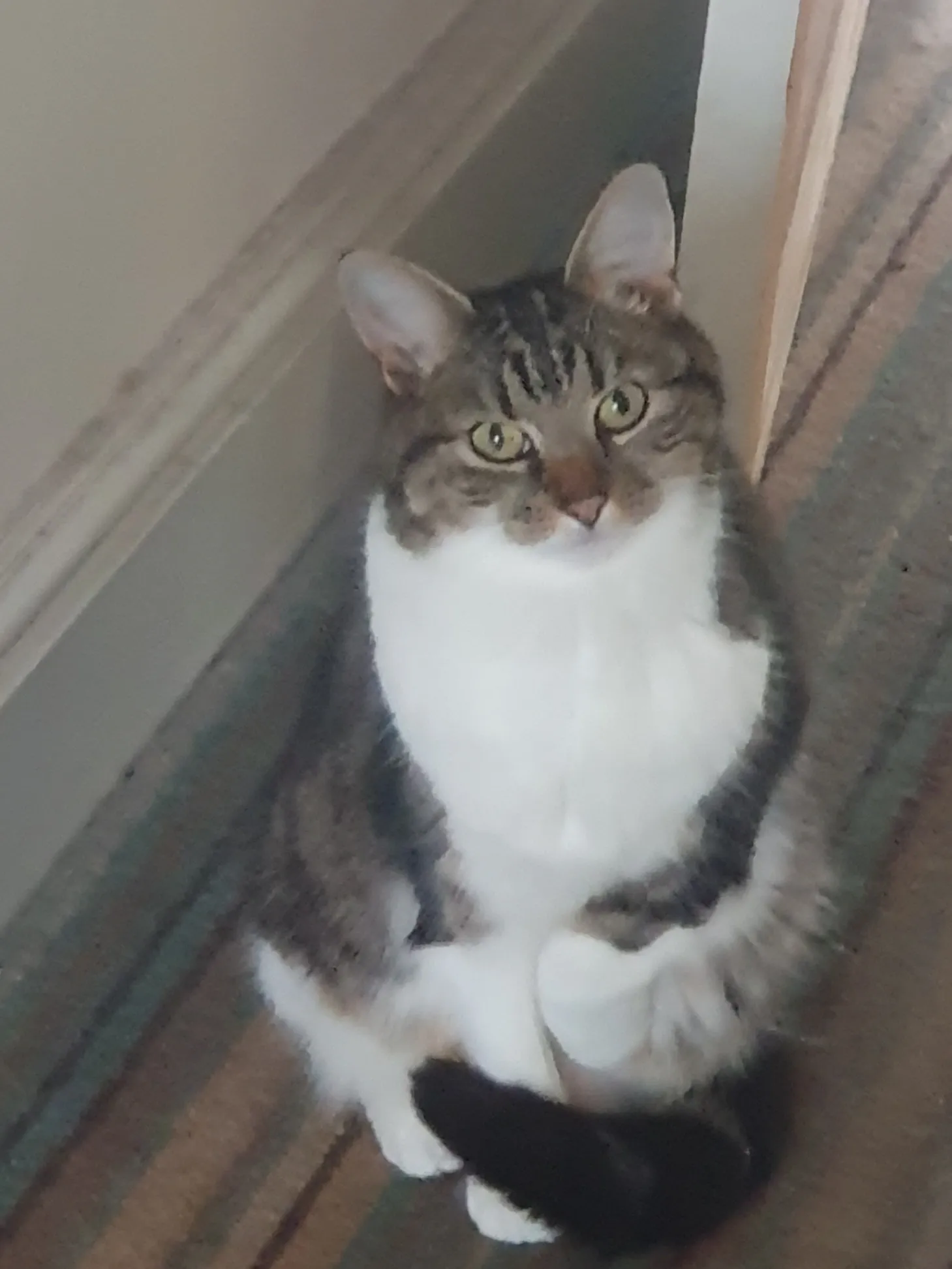 9 months old, photo is old as camera broke. White paws and small white fleck on top lip. Tuxedo ghost tabby