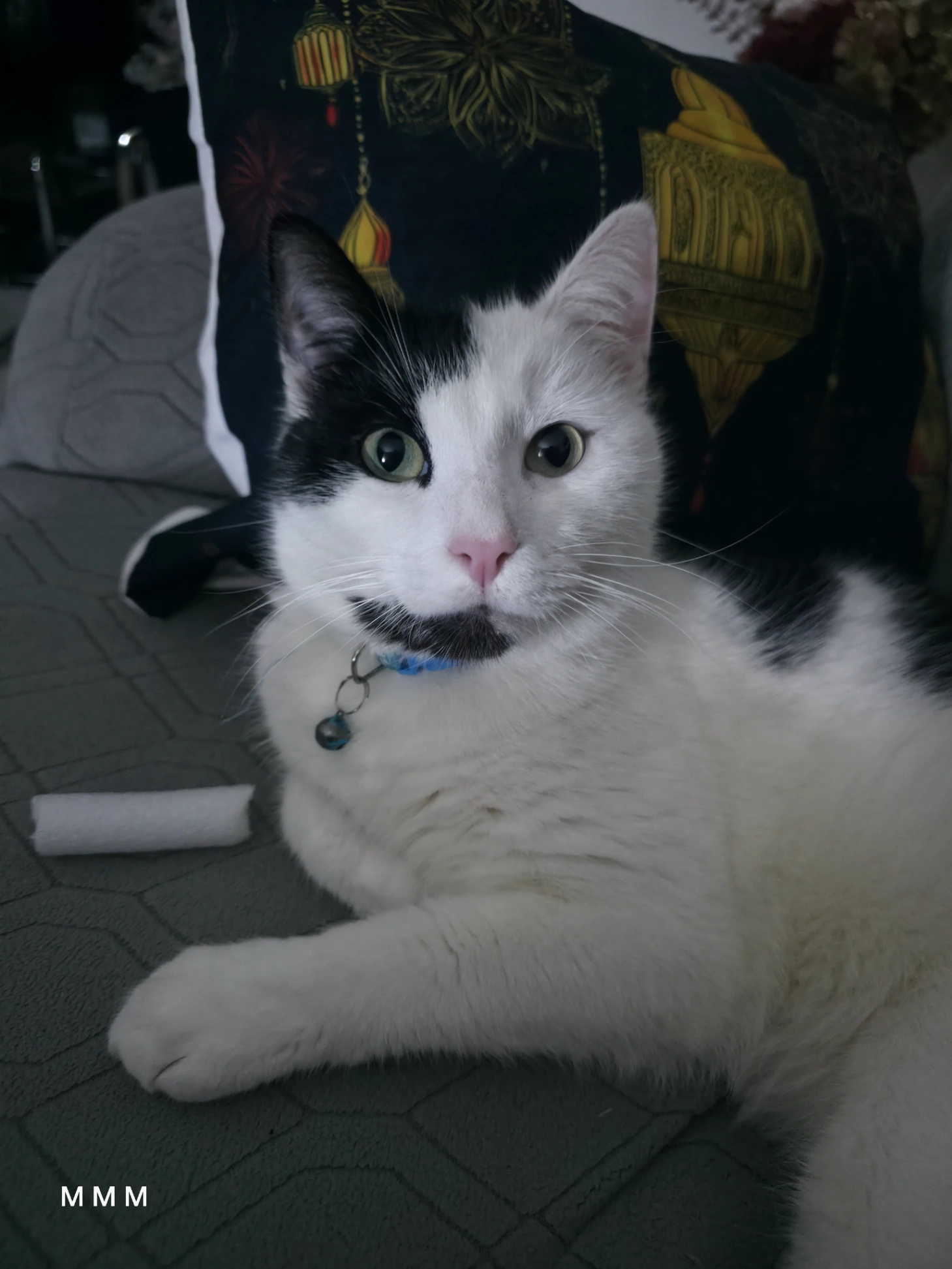 Tommy has a green neck strap with a bell.