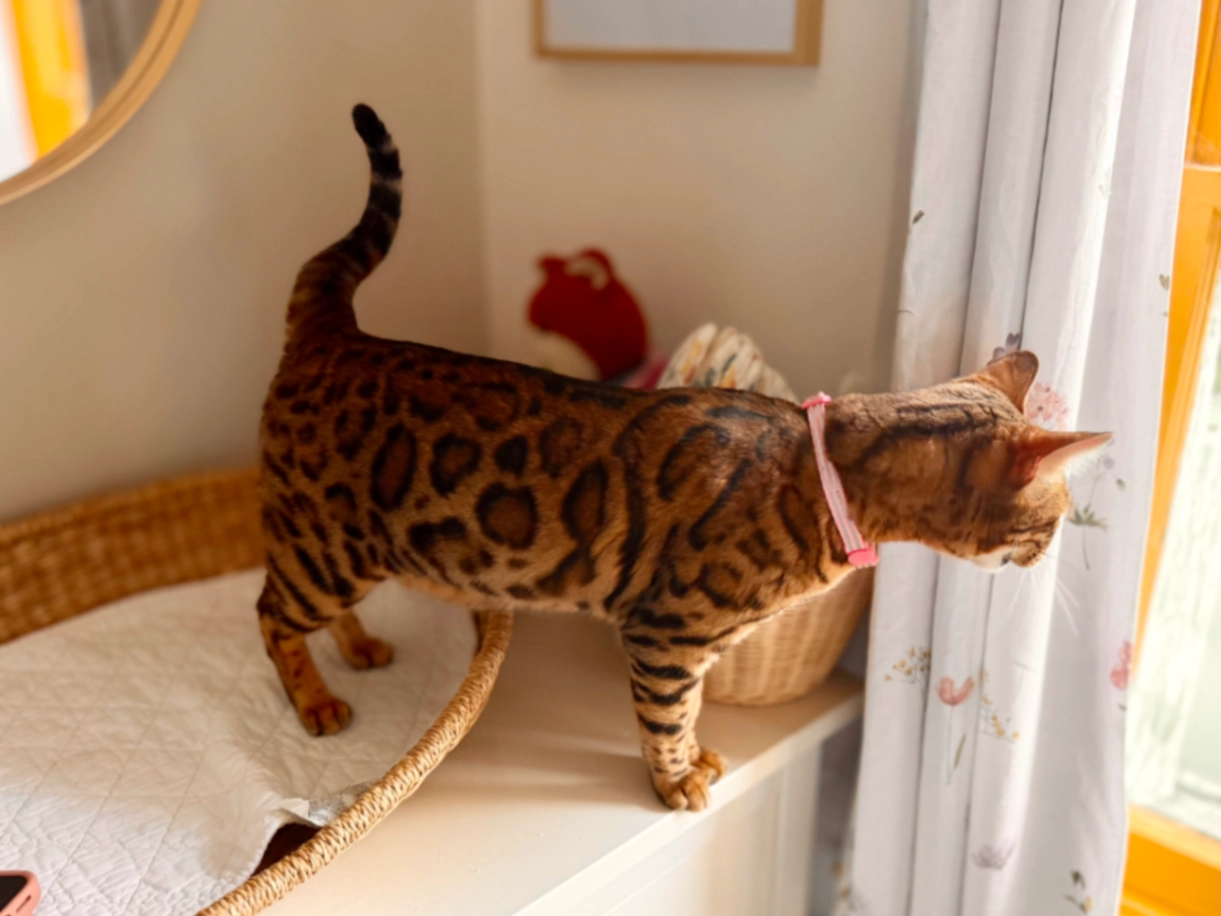 Coco is a bengal cat who has a bald patch on her left side that has slightly grown out from where she has been spayed. She is wearing a pink collar that has a small pink bell on it