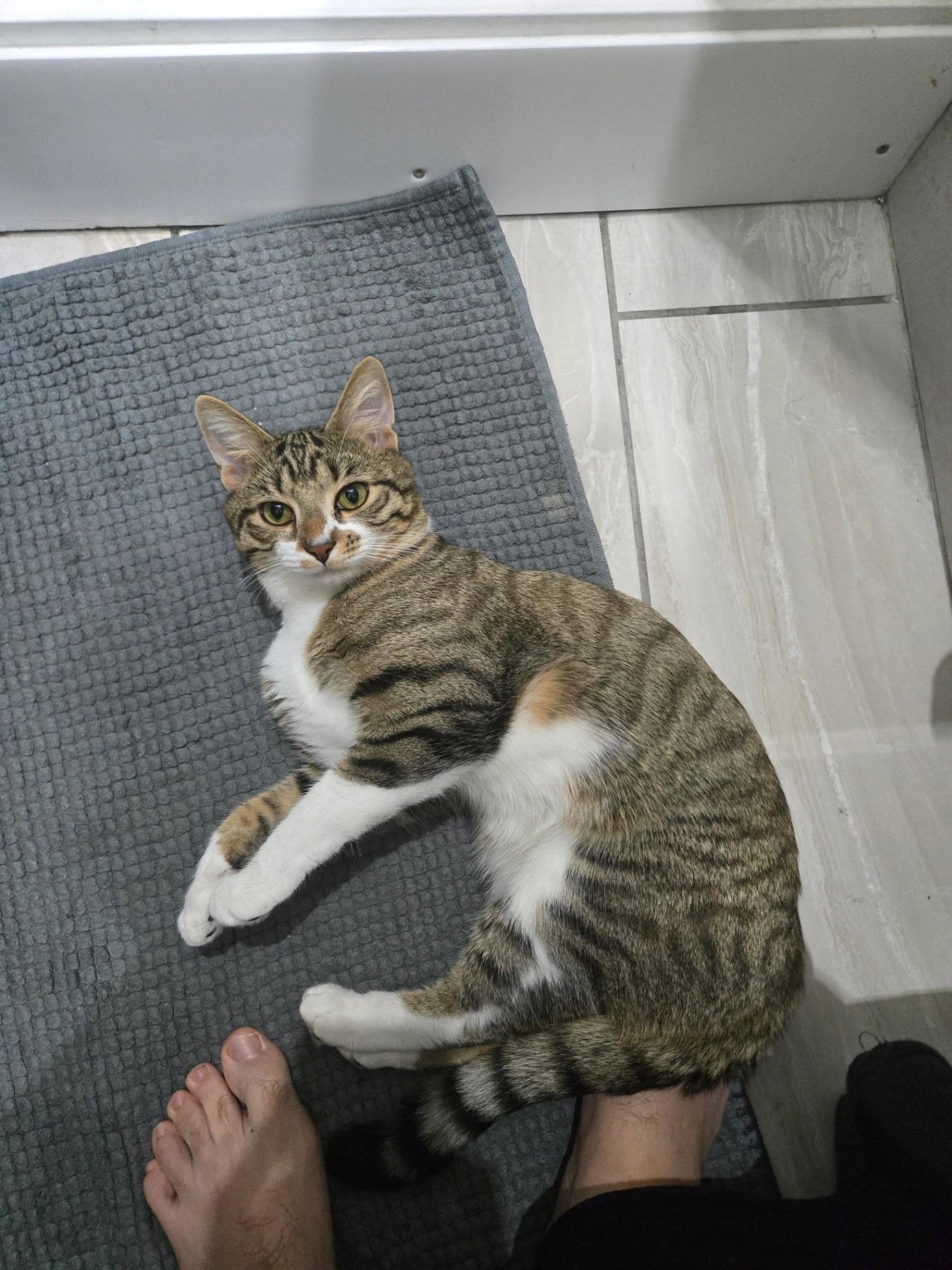 He's friendly, with a very noticeable torn ear on his right ear. He's got what I would call white fur under his front armpits and a white bit on his belly