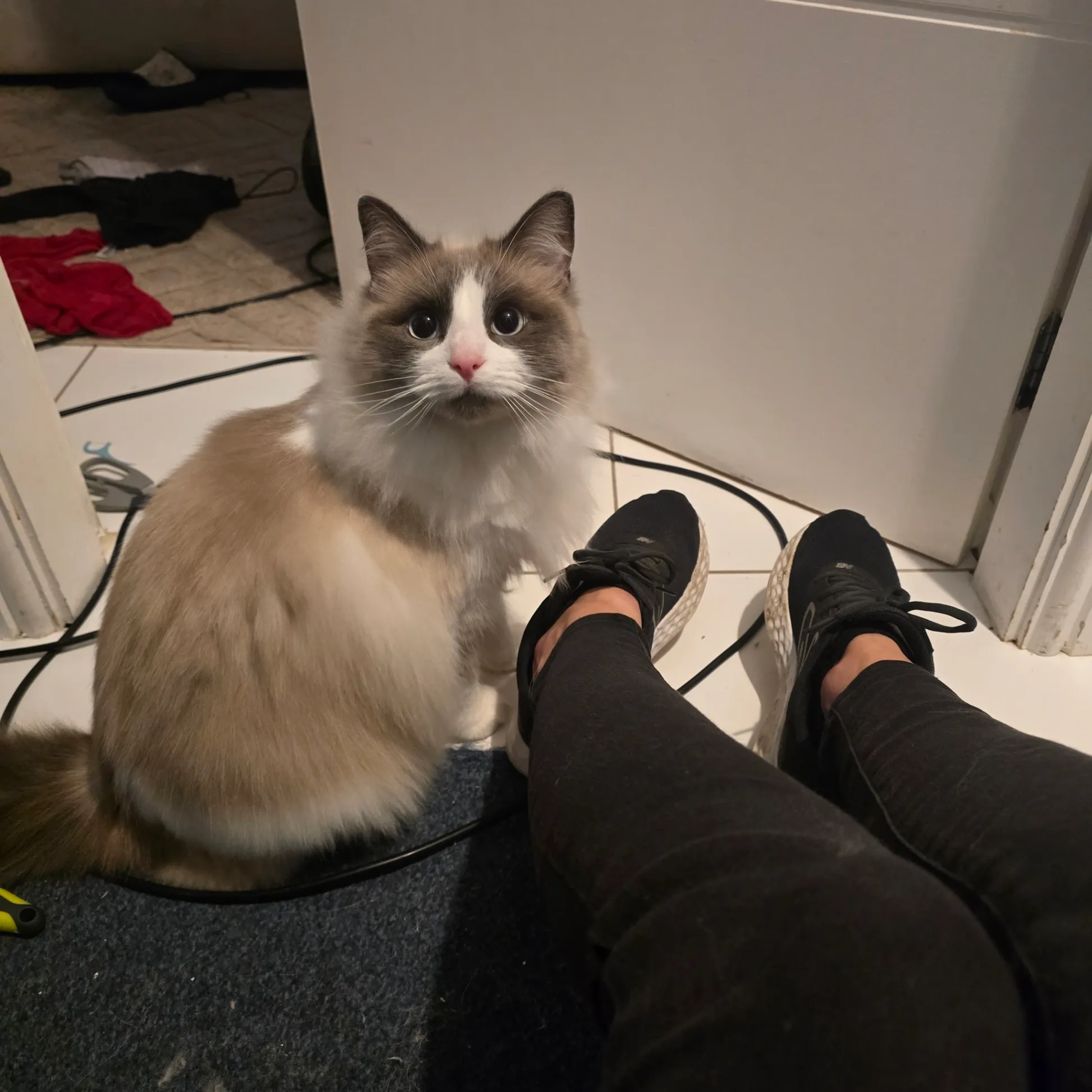 2-year old tuxedo cat. She has white paws, chest and tummy. Green/brown eyes. She’s quite small at around 3.5kg. Very curious and friendly and loves a treat.
