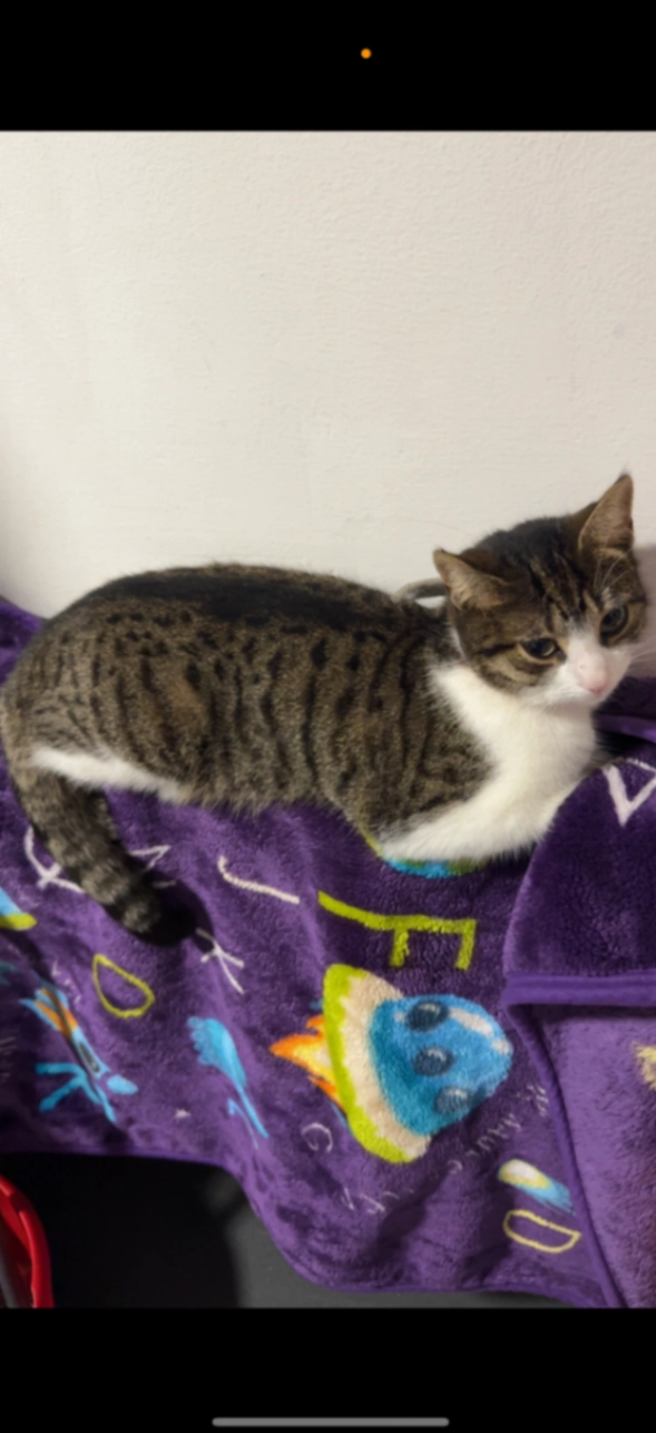 Mostly grey on her back and white on her neck and stomach she is small for a one year old cat