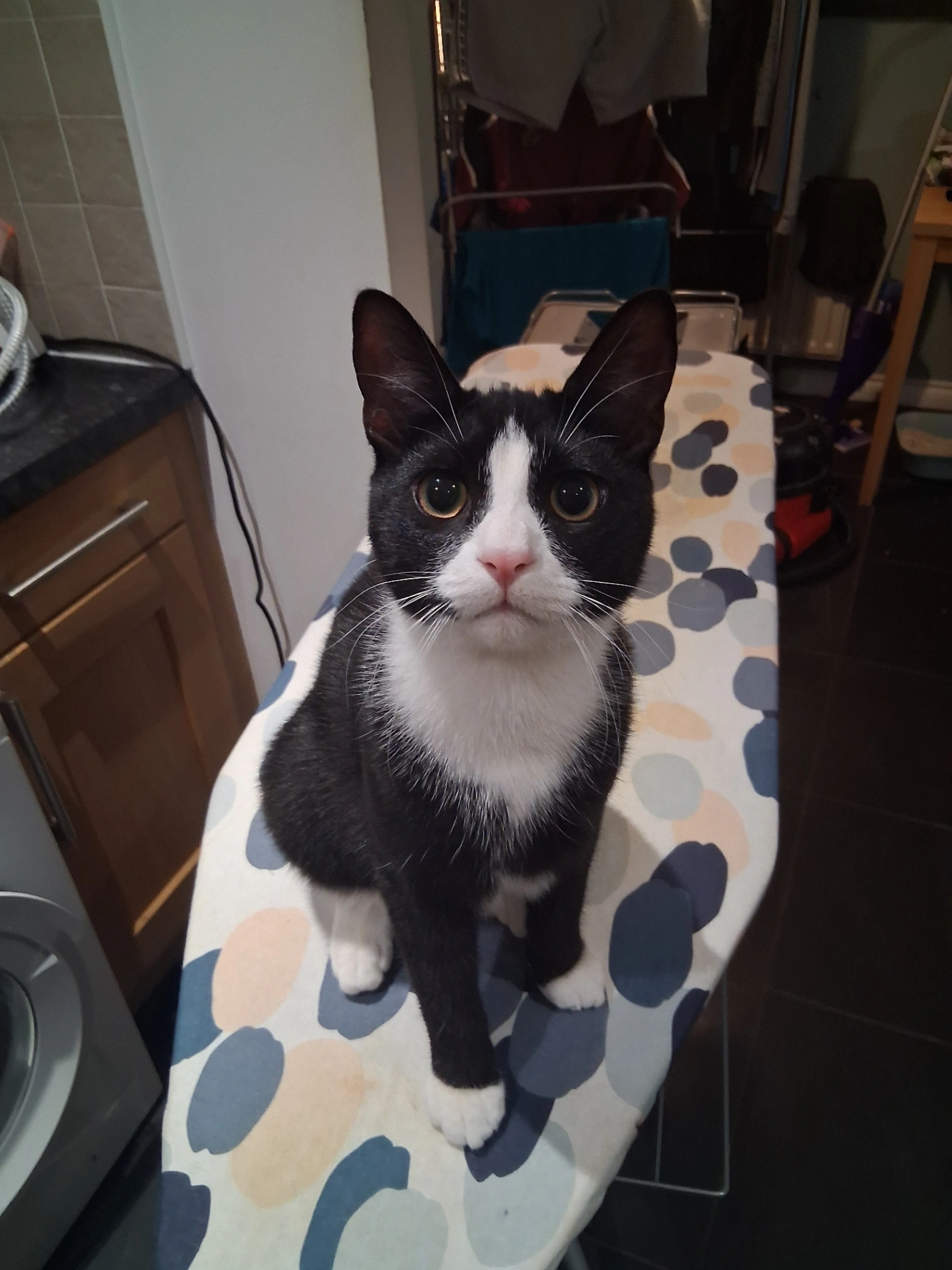 Black and white cat with peach nose, very timid. Microchipped.