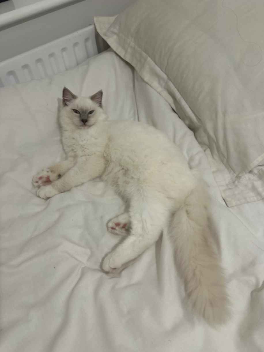 He is 8 months old, around 4.5kg. Blue eyes, mitted paws and a light brown tail.