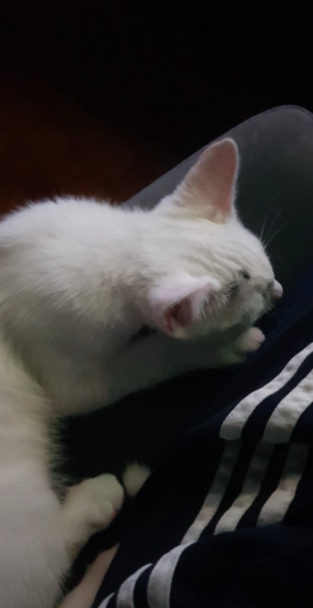 He has a mostly black tail with some white in it and a two small black patches infront of this left ear his body is white