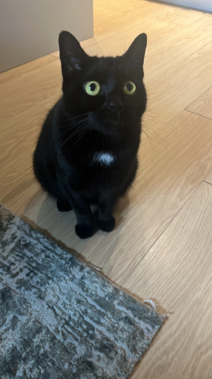 All black female cat, 1 year old, has a shaved patch on her side from a recent spay operation. Shes never been outside so may be very distressed