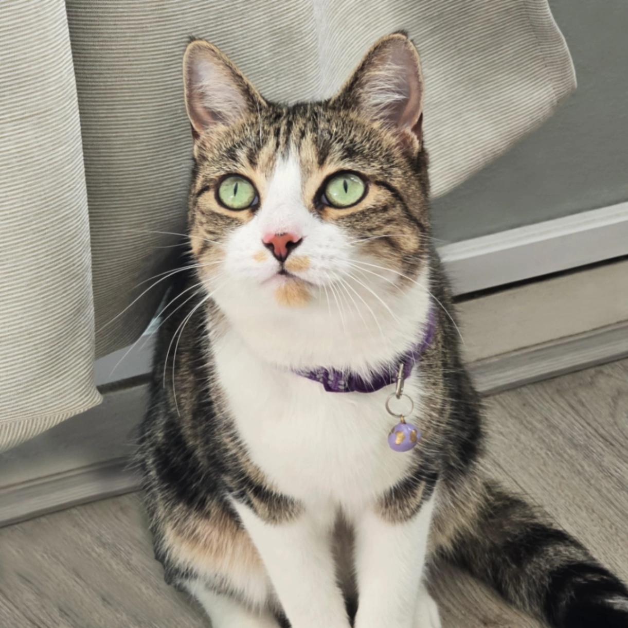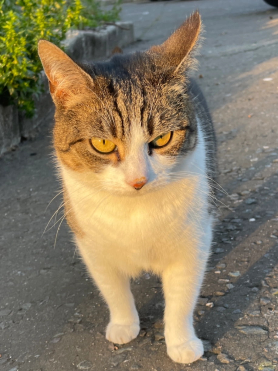 Small slim brown/grey tabby female with white chest and white paws, green eyes, short hair, and medium-length striped tail. Not spayed. Microchipped, no collar. Friendly and curious. Recently moved to the area.
