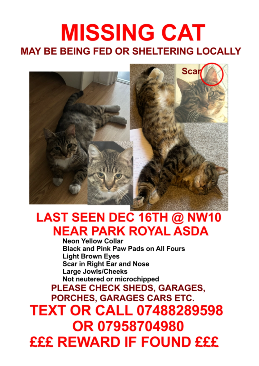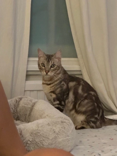 Grey Bengal, likely very scared. May be quite vocal (maoewing a lot). Indoor cat not used to being outside. Lost from south worple way and possibly hiding in gardens nearbye