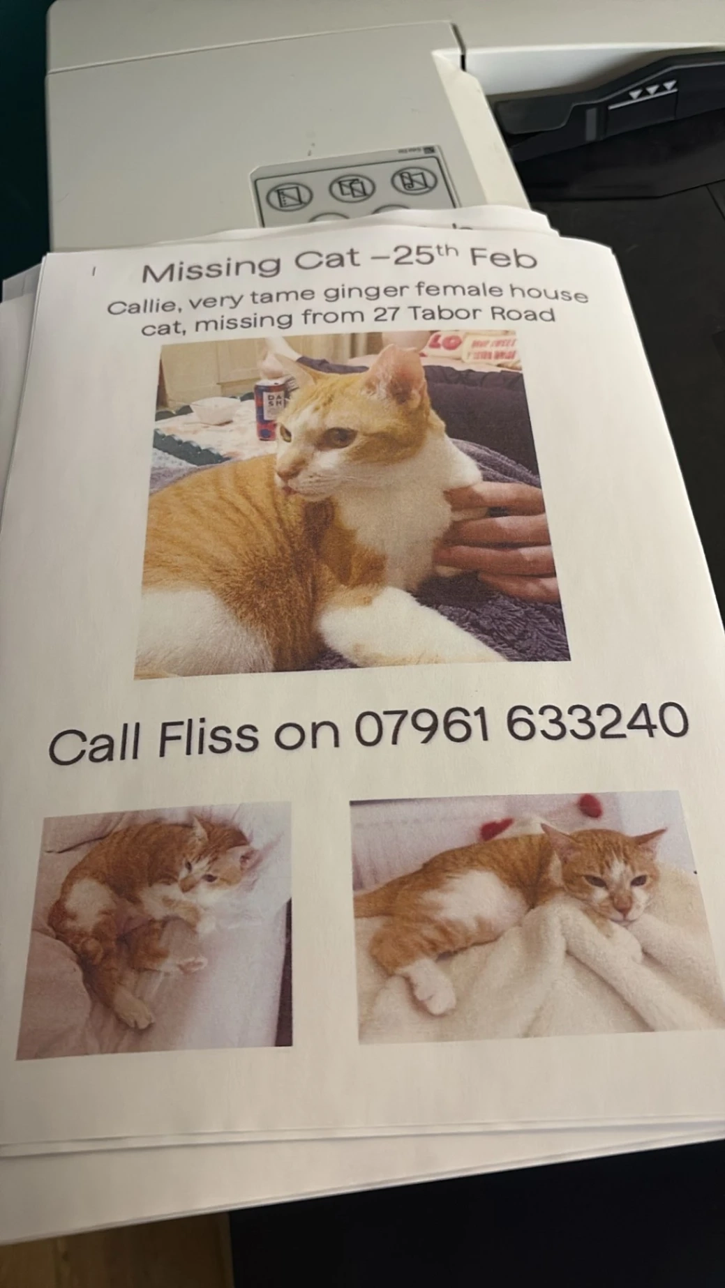 Callie is a very tame ginger female house cat, missing from 27 Tabor Road.