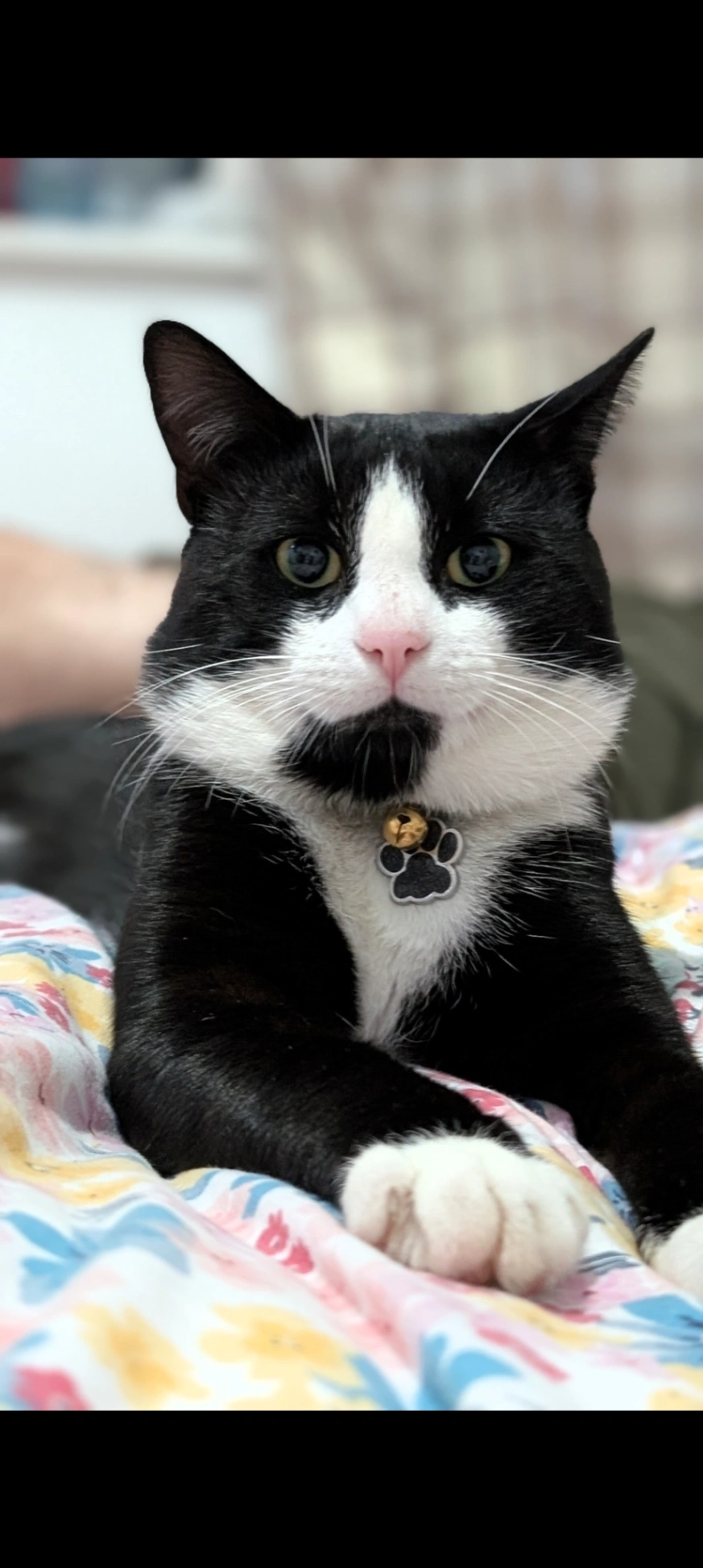 He has mostly black front legs with white “sock-like” markings on his paws and was wearing a silver collar with a name tag and small bell.