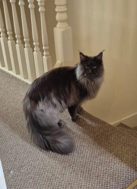 Large, friendly, fluffy, grey main coon cat, trying to get home.
