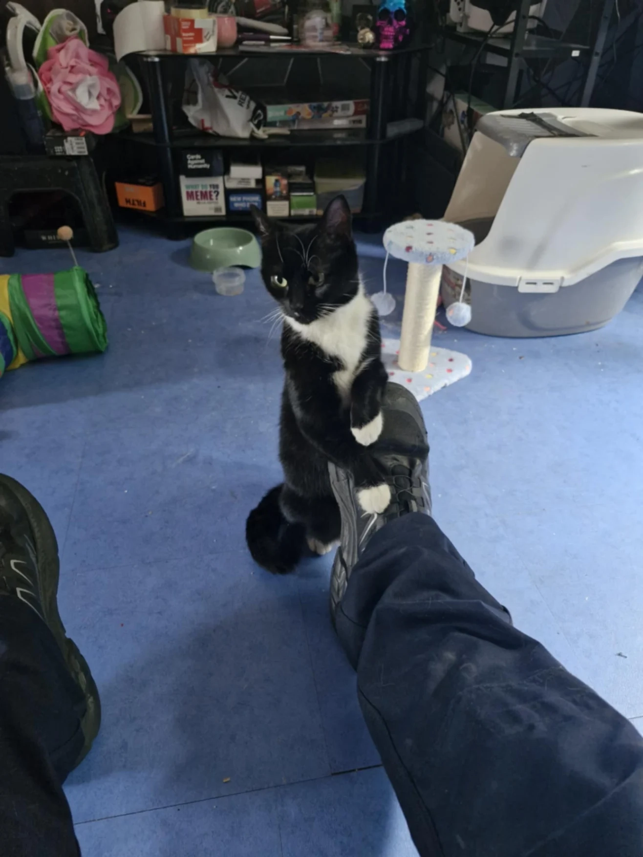 Belle is quite small cat, she is timid and has a distinctive front legs one white leg and one grey with white paw