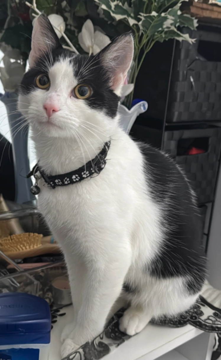 Black and white domestic shorthair. Wearing black collar with white paw prints