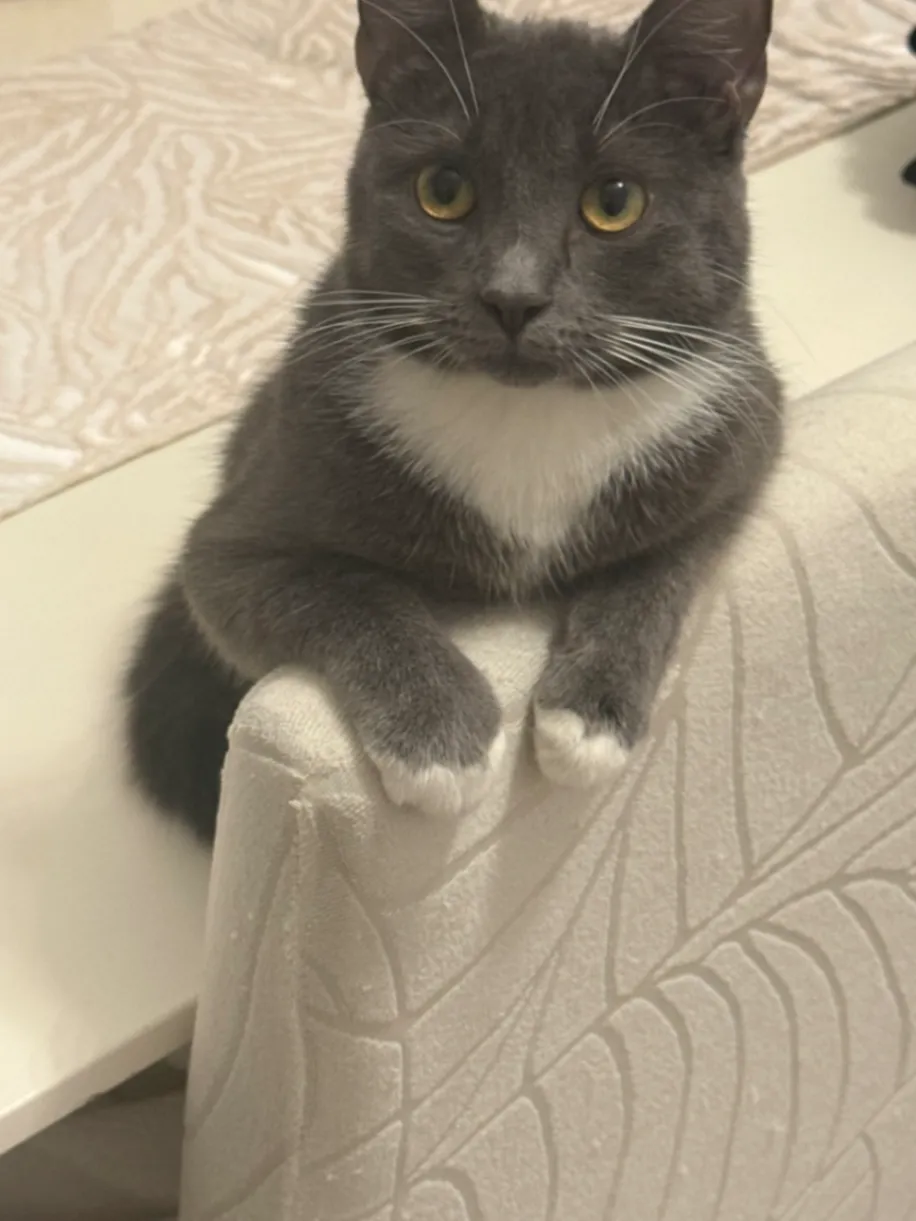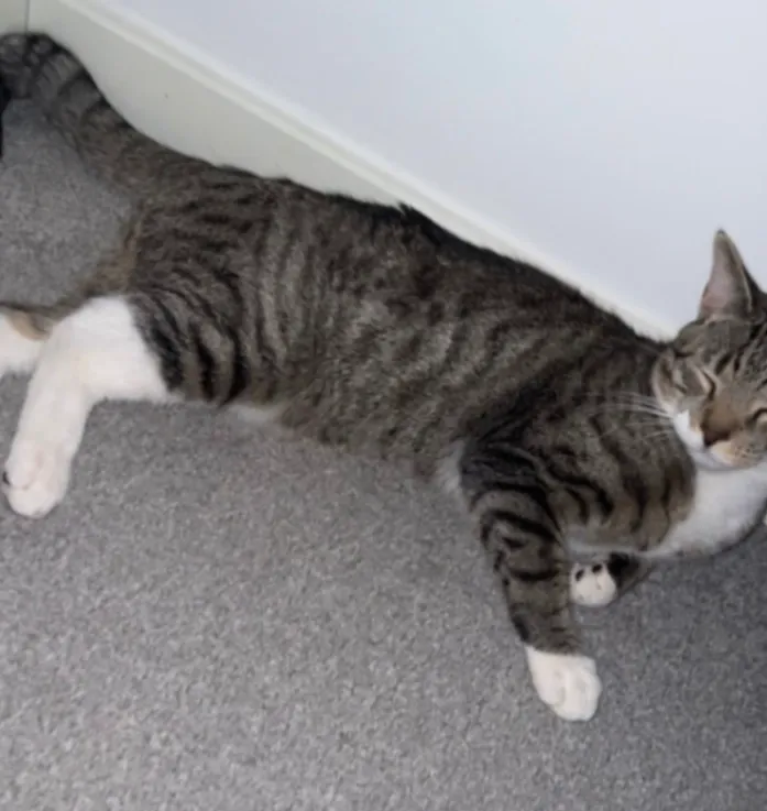 Male tabby cat with short fur. Grey and black striped coat (classic tabby pattern) with white chest, belly, and white paws. He has a white face with a pink nose and noticeable white whiskers. One distinguishing feature is brown colouring on the back of one of his hind legs.