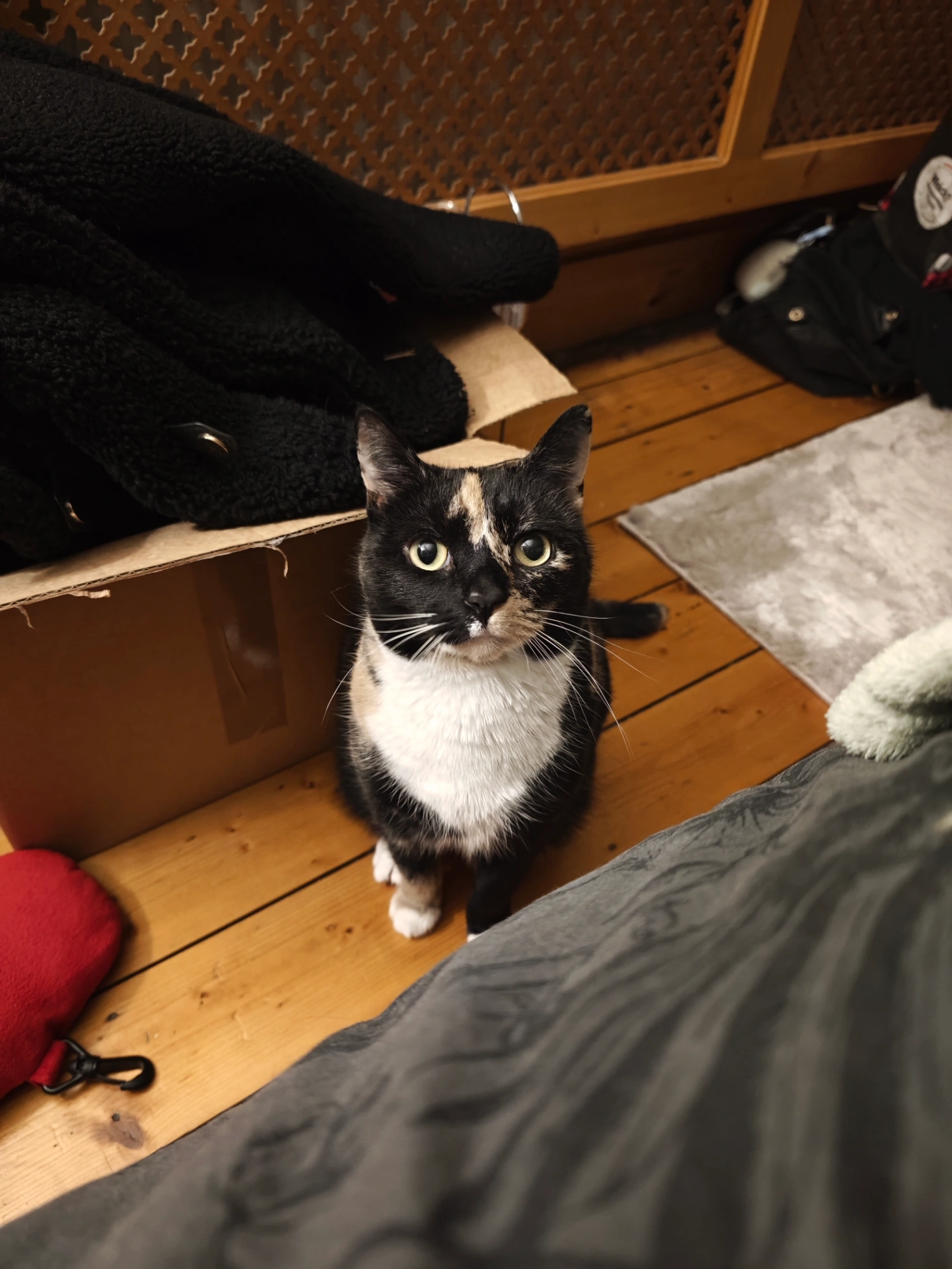 She is a tortoiseshell with a distinctive white bib on her chest and tummy. She is very shy and timid and will likely be hiding, she is microchipped and registered with Longridge Vets.