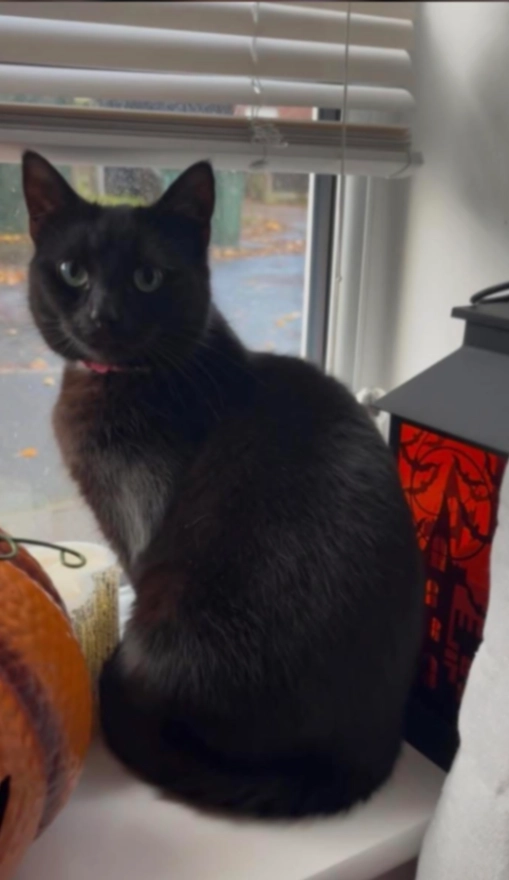 Shes fully black, she kind be shy but friendly. She has a pink collar on.