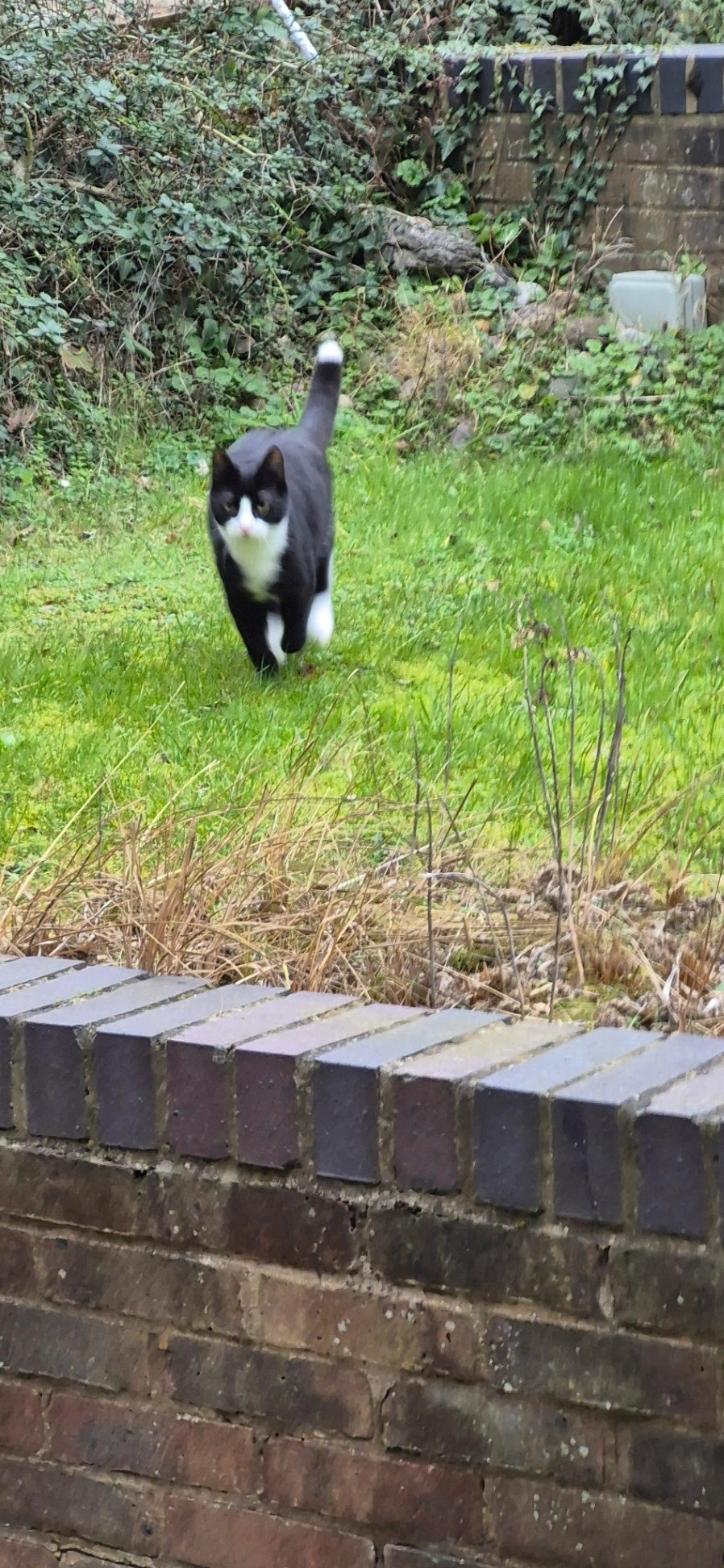 Medium-sized brown-and-white (dark chocolate brown) cat with bright