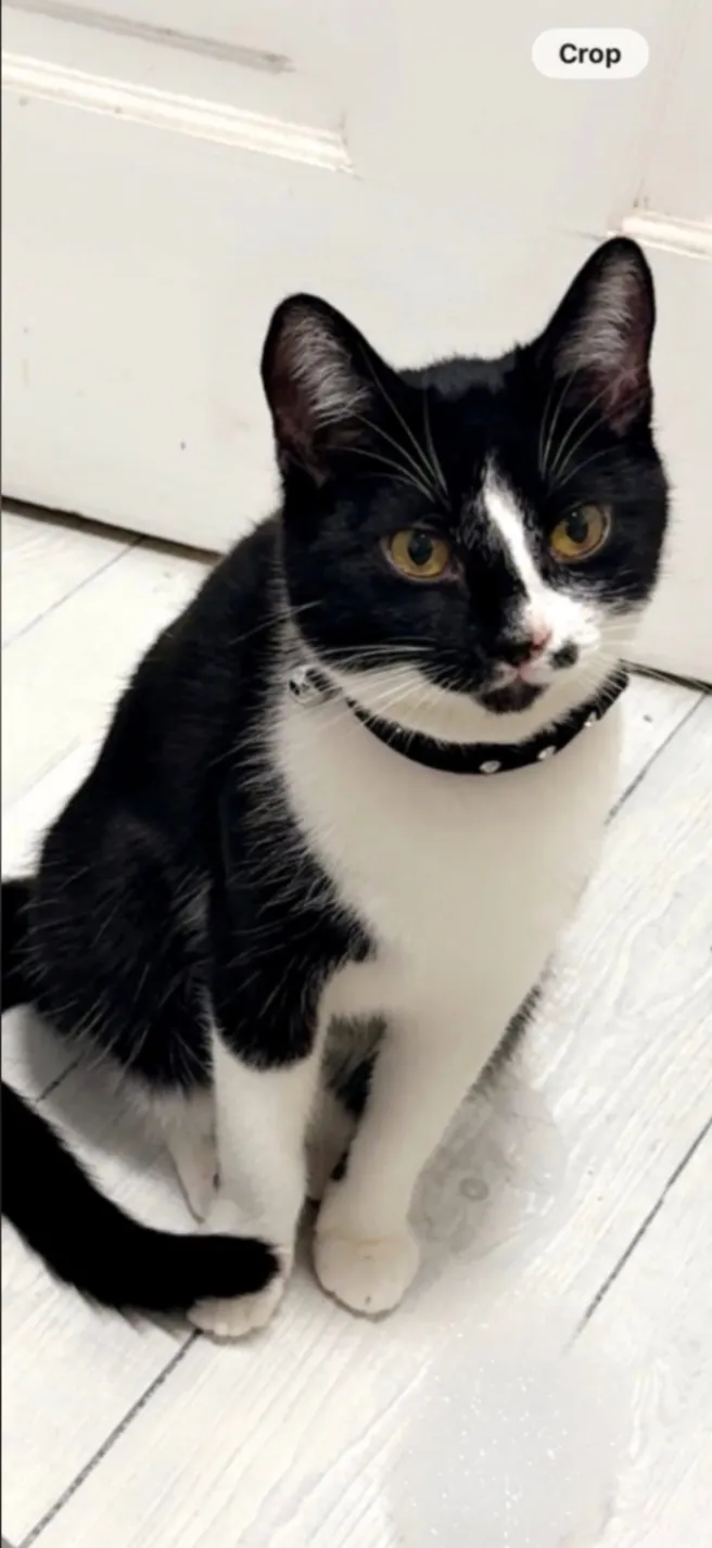 She’s a small black and white cat who is quite slim and is not even 1 year old she is microchipped but not neutered she should have a light pink collar on with a bell on it but it may have gotten lost when she got out we are not sure