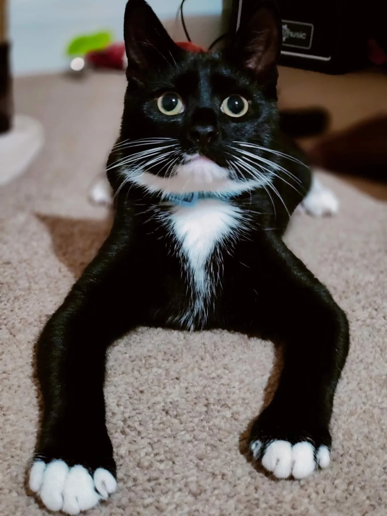 White socks on all paws and longer on the back legs. Small athletic build. White tuxedo with white mark to right top lip.