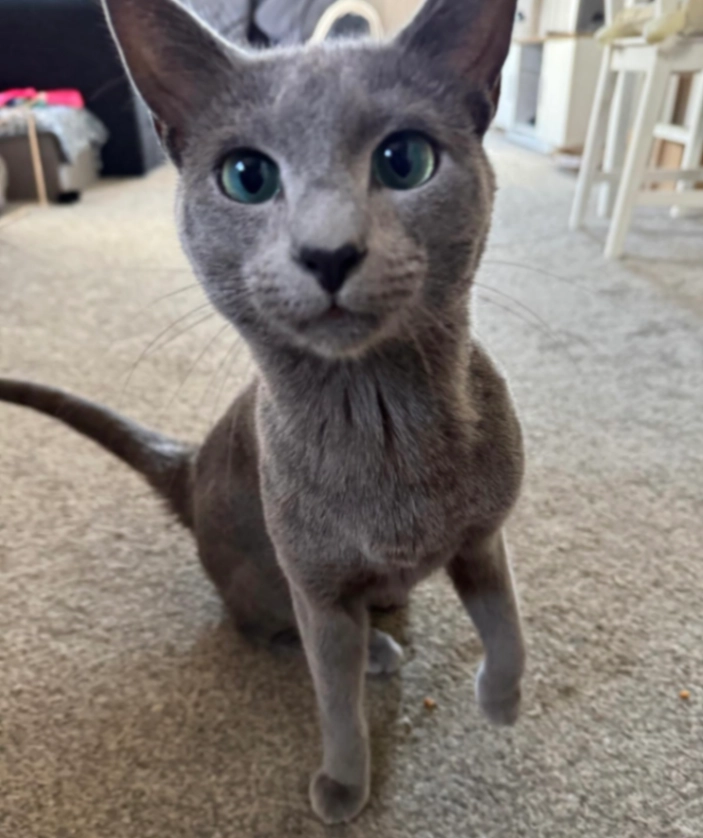 🐱 Appearance: Grey (solid grey coat), big brownish/yellow eyes