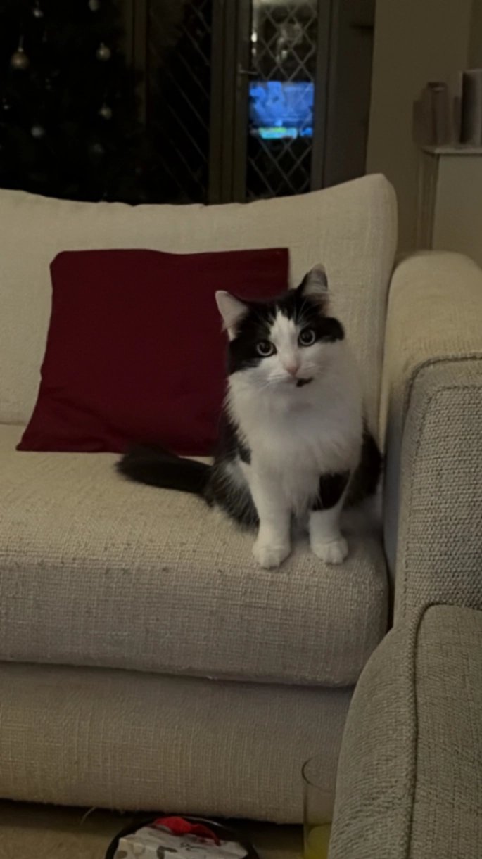He’s a Maine coone, so quite large, and has white fur.