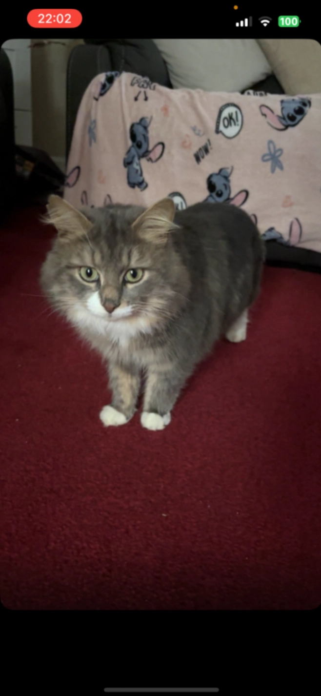 Very shy and is a nervous cat , has a little chip in his ear and his nose is rough and he got white paws , he got a greyish light brown coat with a hint of white and is very fluffy tail . He likes to run away and hide , His whiskers is very long