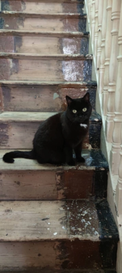 Small round black cat with white patch on neck no collar microchipped any information helpful 0851588297