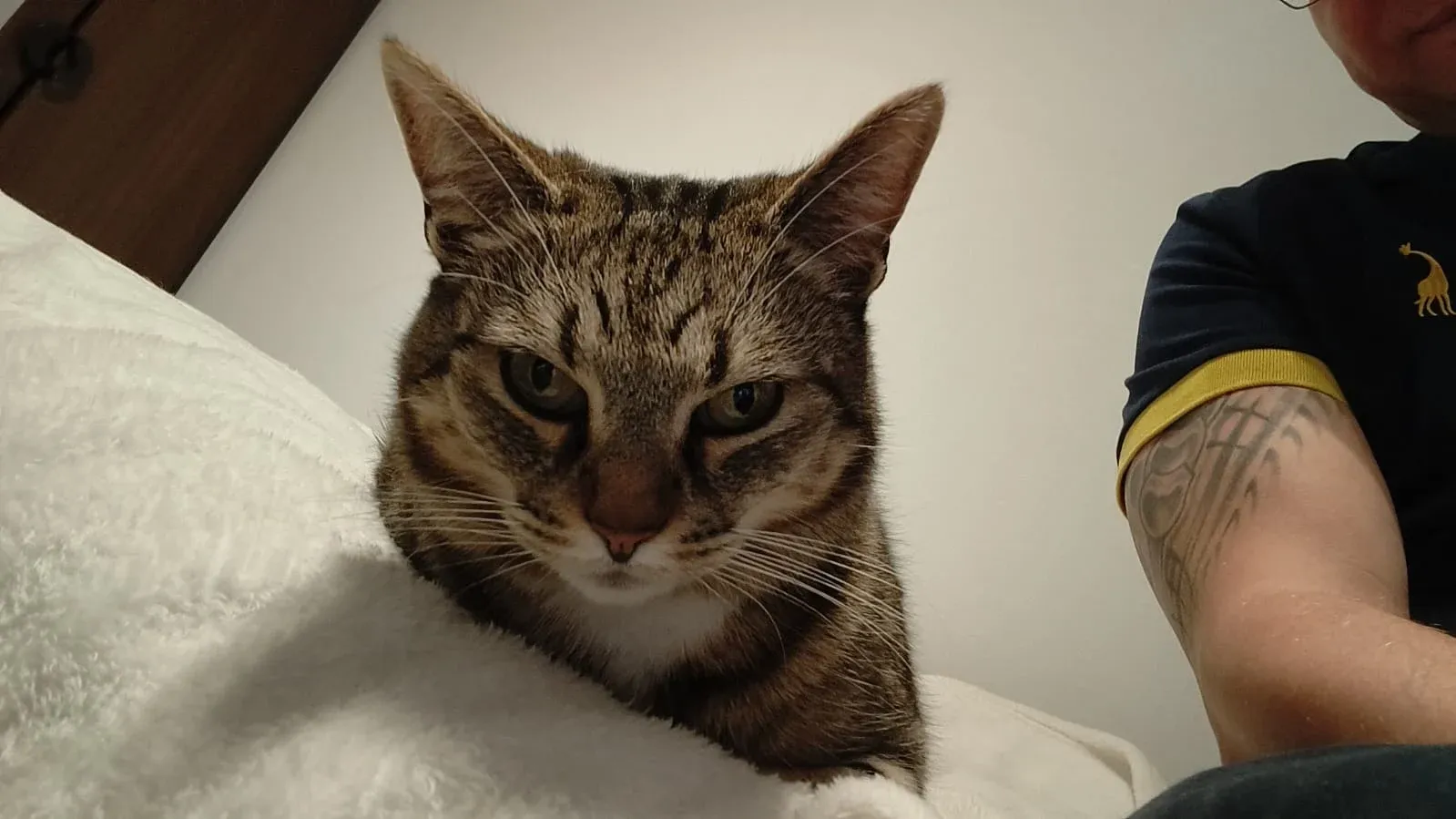 She is 8 years old tabby cat with white socks. Missing one fang.