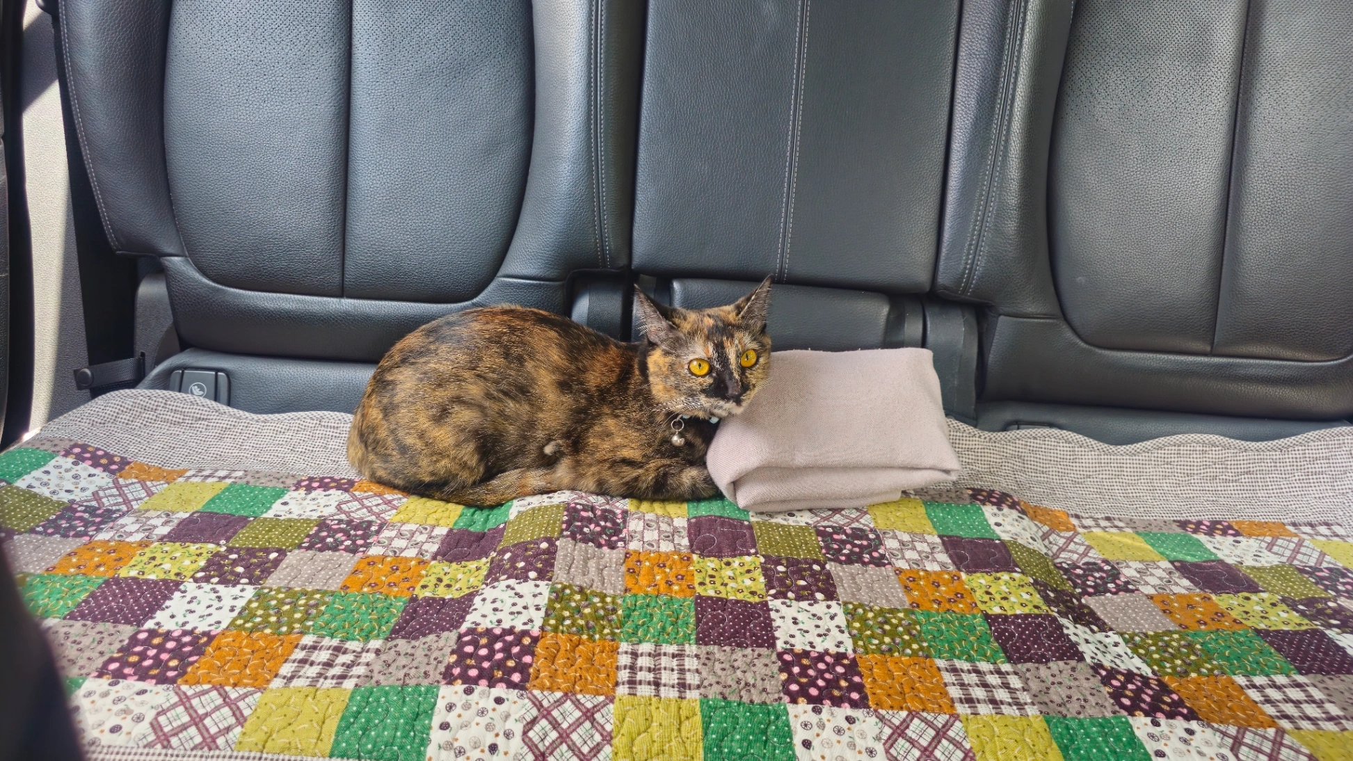 Brown, short hair with black markings on her eyes. White fur around and under her mouth and chin. Stripes on legs. Blue collar with beads and a bell. Please find her.